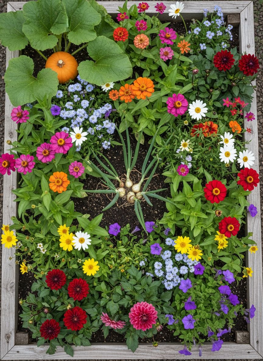 Onions, garlic, and chives act as bodyguards for your leafy greens. Their pungent aroma deters aphids and rabbits. Interspersing spiky allium leaves among broad-leafed kale or lettuce creates a striking geometric contrast. The vertical spikes break up the visual monotony of low-growing greens. Plant garlic cloves in a circle around your lettuce patch in late autumn for a spring harvest that protects your salad greens.