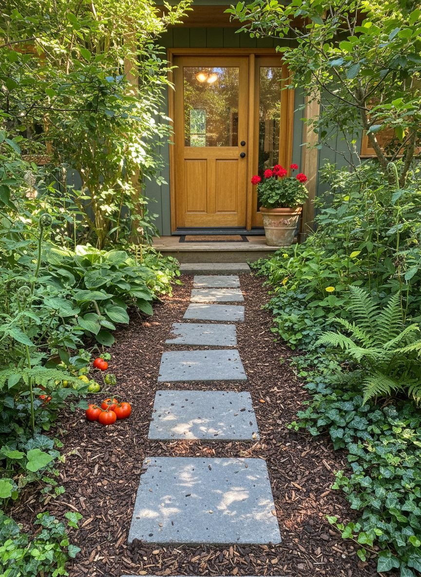 Place flat flagstones or pavers surrounded by creeping thyme or chamomile. When you step on the herbs, they release a pleasant fragrance. This softens the hardscape and adds more greenery to the footprint. It creates a “secret garden” vibe. Ensure stones are level with the ground to prevent tripping hazards.