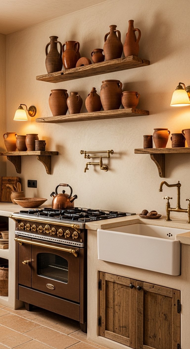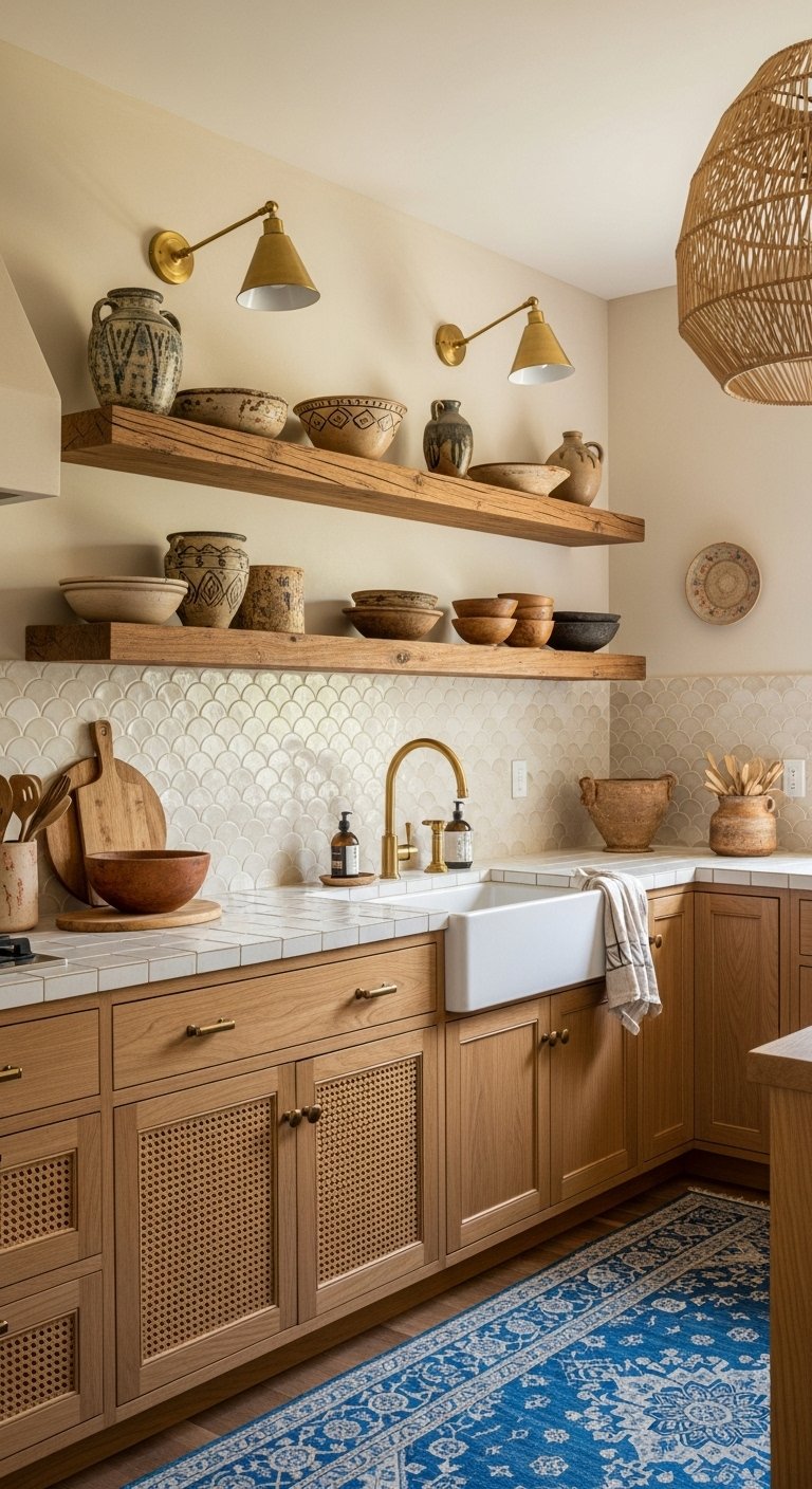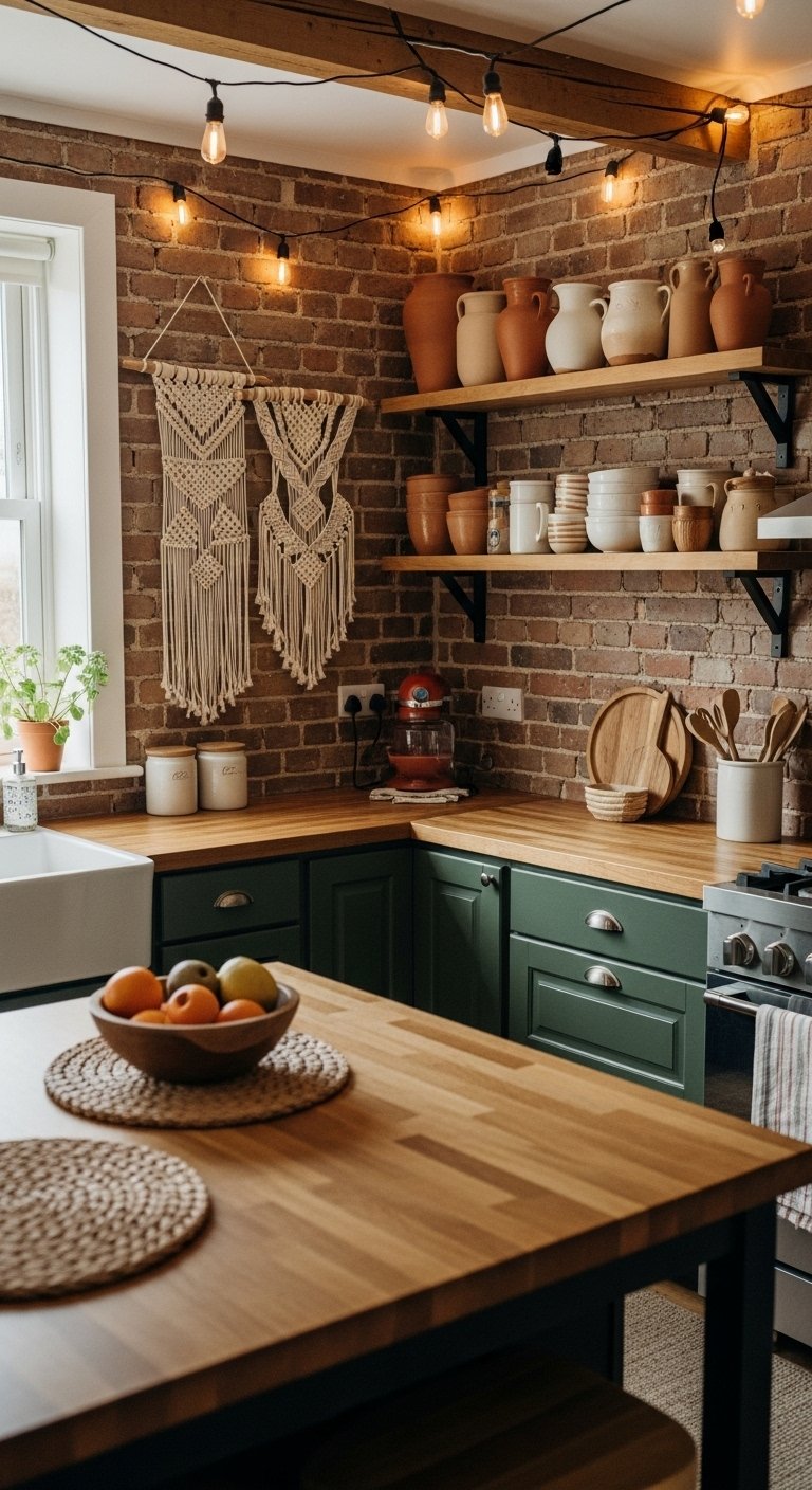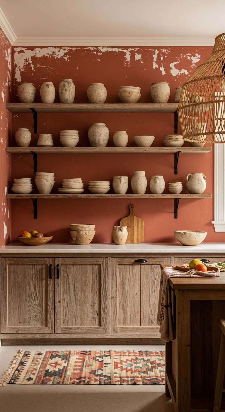 Pair these rich clay tones with natural wood elements. We are not talking about perfectly polished mahogany here. Instead, look for reclaimed wood, raw oak, or butcher block countertops that show a bit of grain and texture. Open shelving made from thick, rough-hewn planks is a fantastic way to display your stoneware and glass jars, further enhancing the organic feel. The interplay between the cool, smooth surface of a clay pot and the rough, warm texture of a wooden shelf creates a tactile experience that defines the boho aesthetic.