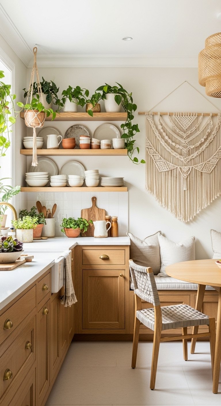 Scandi-Boho is a massively popular trend that combines Nordic functionality with Bohemian warmth. It takes the white walls and light woods of Scandinavian design and adds the layers and textures of boho style. The result is a bright, happy space that feels both organized and cozy. It is perfect for smaller kitchens as the light colors make the room feel larger.