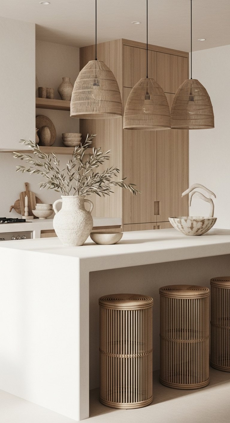 Start with creamy white cabinets and add texture through woven elements. Rattan pendant lights are a staple for this look, casting beautiful, intricate shadows when lit. You can also swap out standard cabinet hardware for leather pulls or wooden knobs. Introduce textiles like a linen roman shade or a jute runner rug to soften the hard surfaces of appliances and countertops. The goal is to create a space that feels soft to the touch and visually quiet, allowing you to relax the moment you walk in.