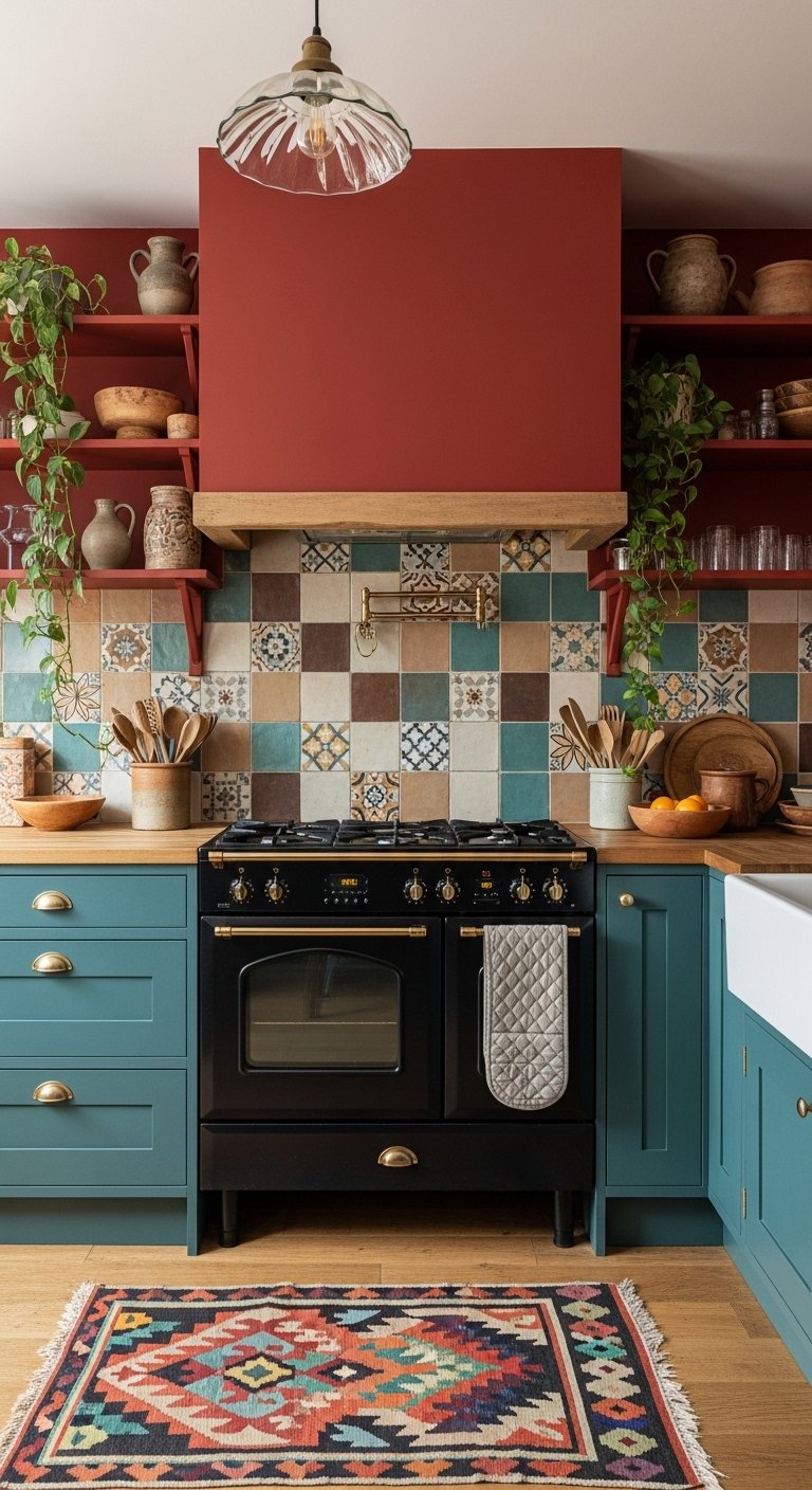 Start with a statement backsplash using Zellige tiles or patterned cement tiles. These handmade tiles reflect light beautifully and add an artisan touch. Lantern-style pendant lights made of brass or punched metal create mesmerizing light patterns in the evening. Balance these ornate elements with simple wooden cabinetry and perhaps a vintage rug in deep reds and oranges. The result is a kitchen that feels warm, exotic, and deeply personal.