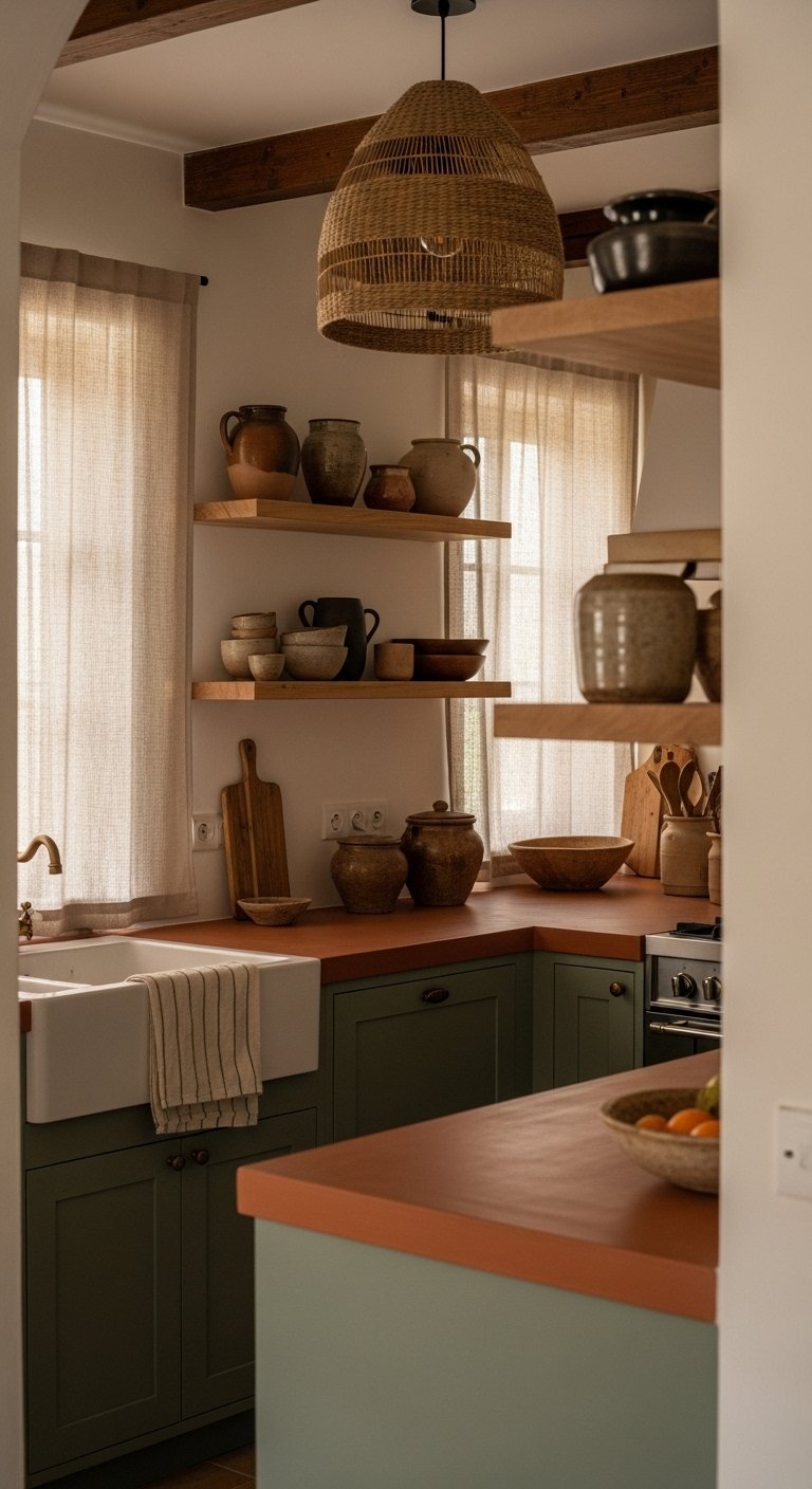 You want to stick to colors found in nature. Warm whites and creams are great for walls. For accents and cabinets, look to terracotta, clay, olive green, sage, mustard yellow, and warm browns. Avoid neon brights or cool, clinical greys. The goal is a palette that feels sun-baked and grounded.
