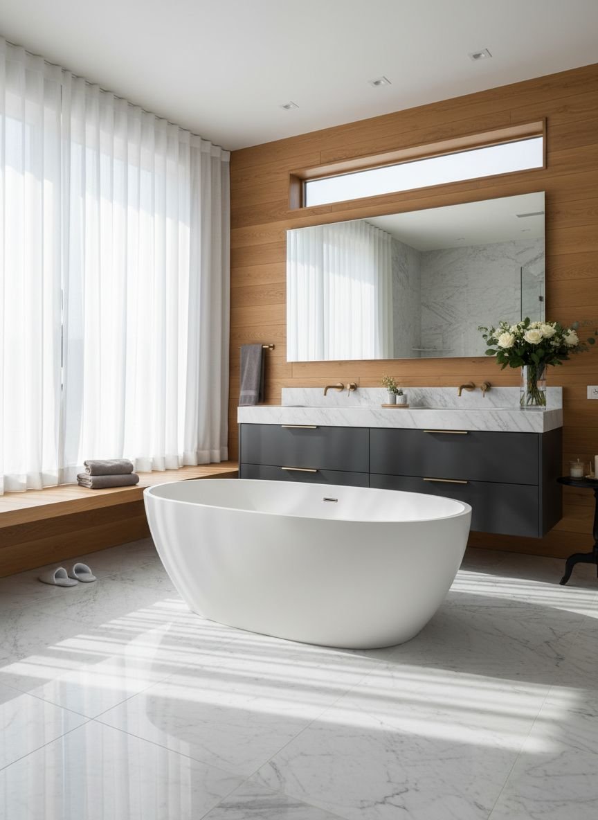 Pro Tip: If you can’t renovate surfaces, add a wooden bath mat or bamboo accessories to instantly warm up a cold, tiled bathroom.
