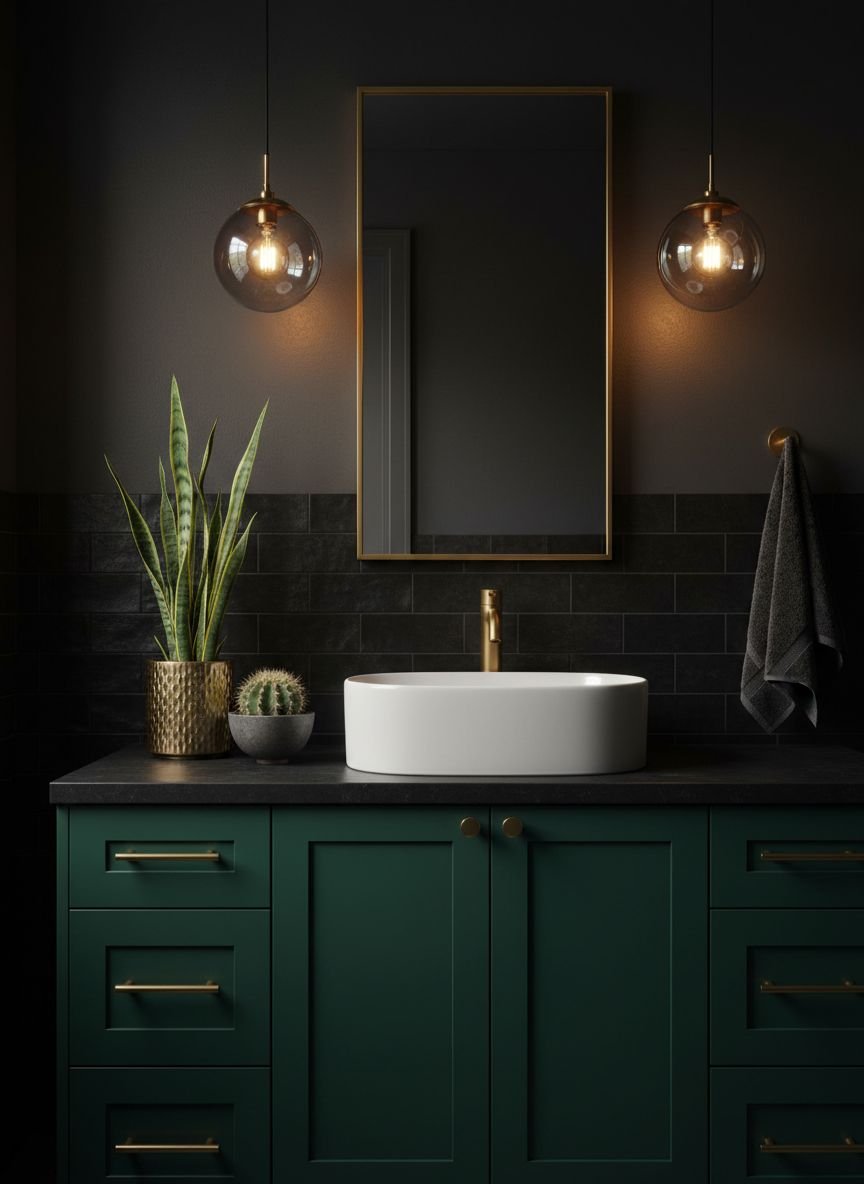 While light and airy is timeless, the “moody” bathroom is the breakout star for 2026, particularly for powder rooms and guest baths. Deep charcoal, navy blue, forest green, and even aubergine are being used to drench walls, ceilings, and trim. This “color drenching” technique blurs the boundaries of the room, actually making small spaces feel larger and more infinite.