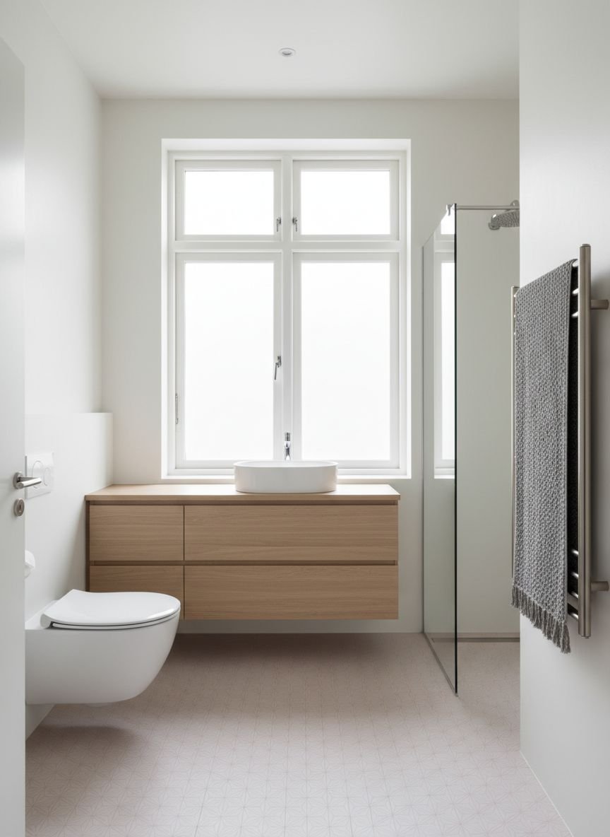 Japandi is the harmonious hybrid of Japanese rustic minimalism and Scandinavian functionality. In the bathroom, this manifests as clean lines, functional spaces, and a complete lack of clutter. The color palette is strictly neutral—creams, soft greys, and pale woods. The focus is on “negative space,” allowing the room to breathe rather than filling every corner with storage or decor.