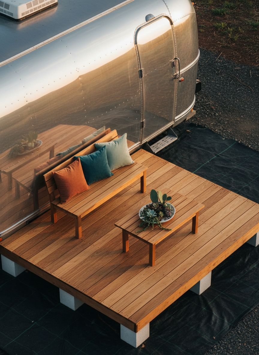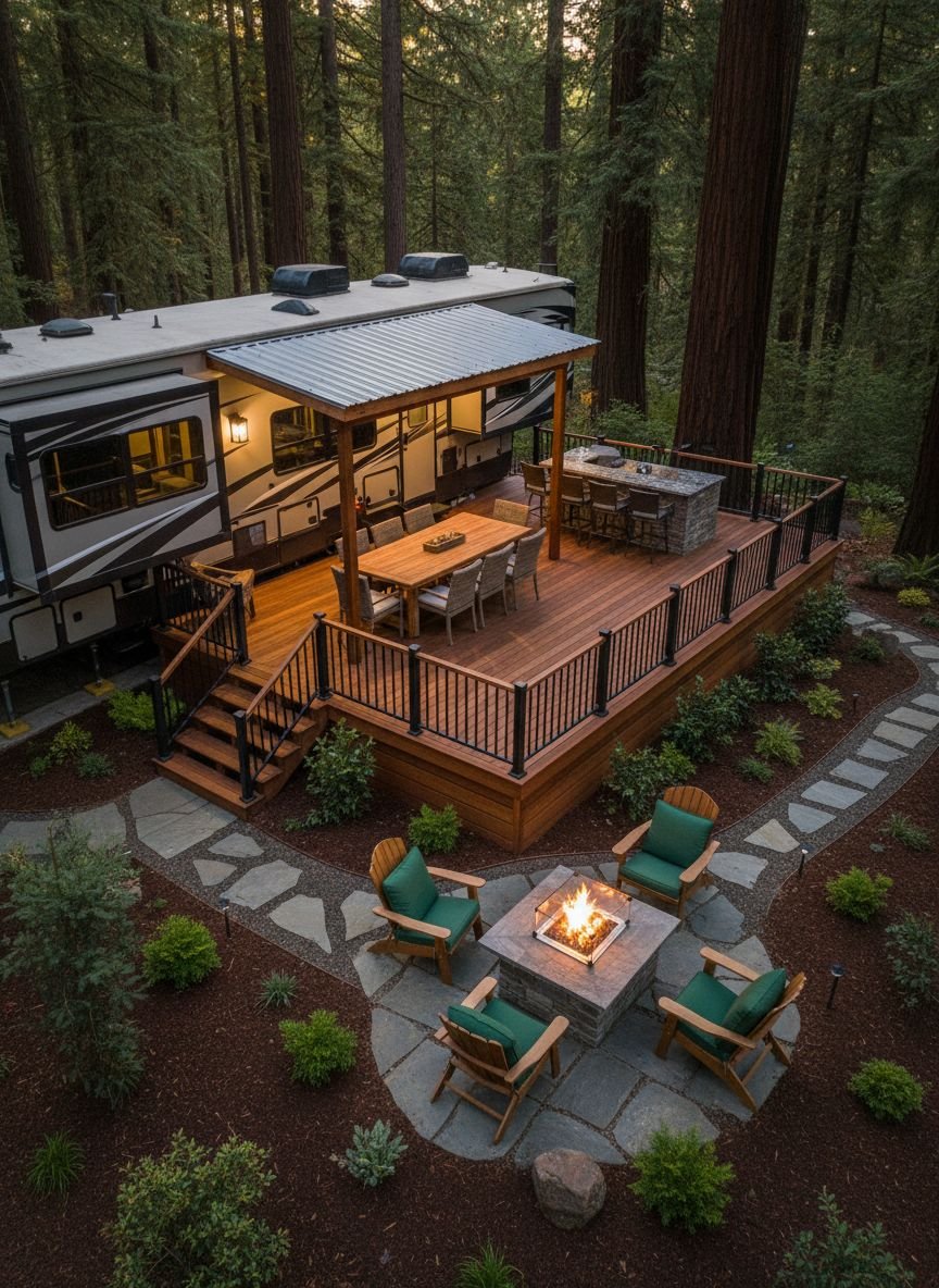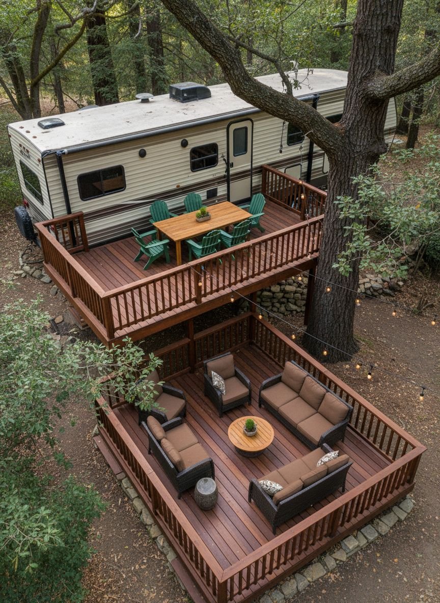 Sloped campsites present a challenge. A multi-level deck turns that challenge into a feature. You build the upper level flush with your RV door. This serves as your entry landing. You build the lower level to match the terrain. Steps connect the two zones. This separation creates distinct “rooms” outdoors. Use the top tier for grilling. Use the lower tier for lounging.