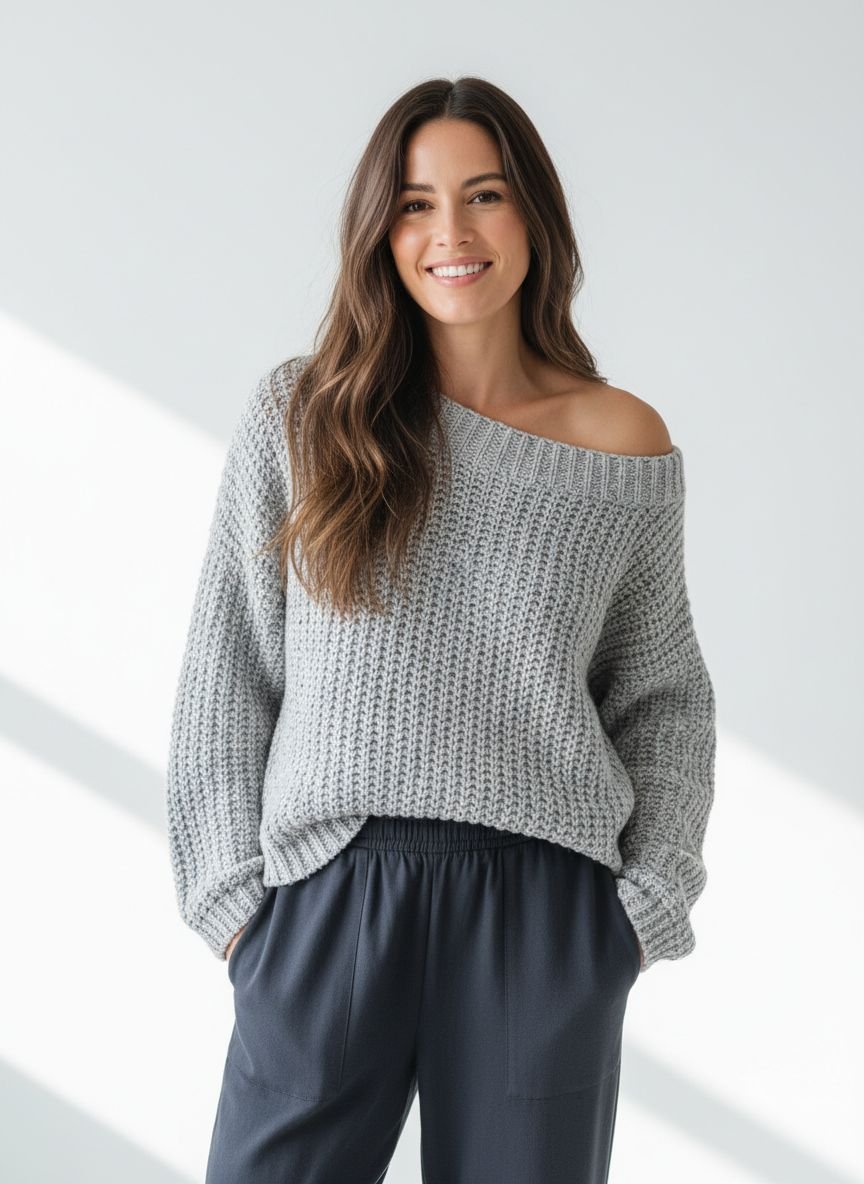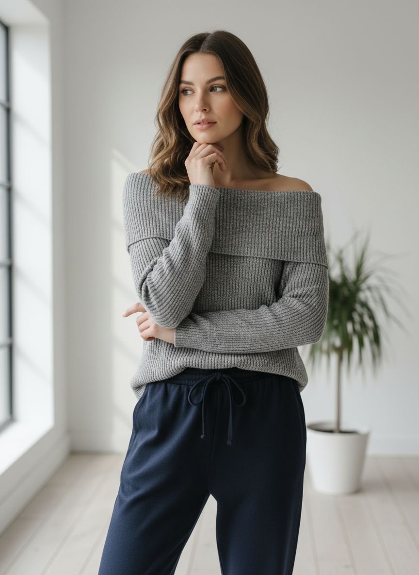The “Fold” sweater gets its name from the dramatic, oversized folded collar that defines the neckline. This double-layer of fabric adds warmth and visual weight to the top of the garment, making your waist look smaller by comparison. It is a very cozy, architectural look that feels high-fashion and expensive.
