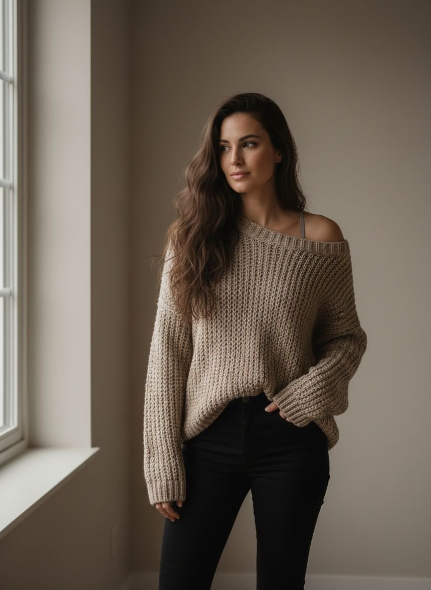 Pro Tip: Sew a strip of velvet ribbon inside the neckline. The friction of the velvet against your skin helps hold the heavy sweater in place.