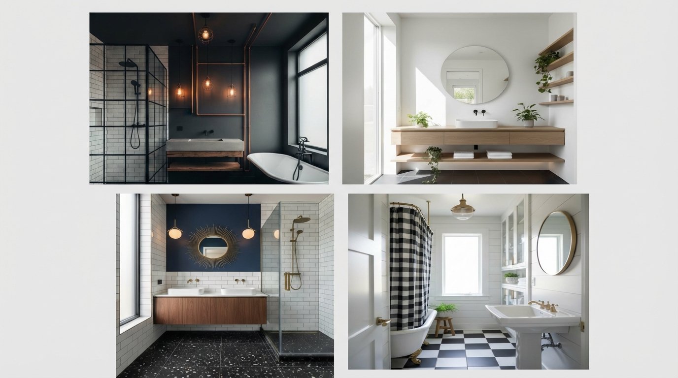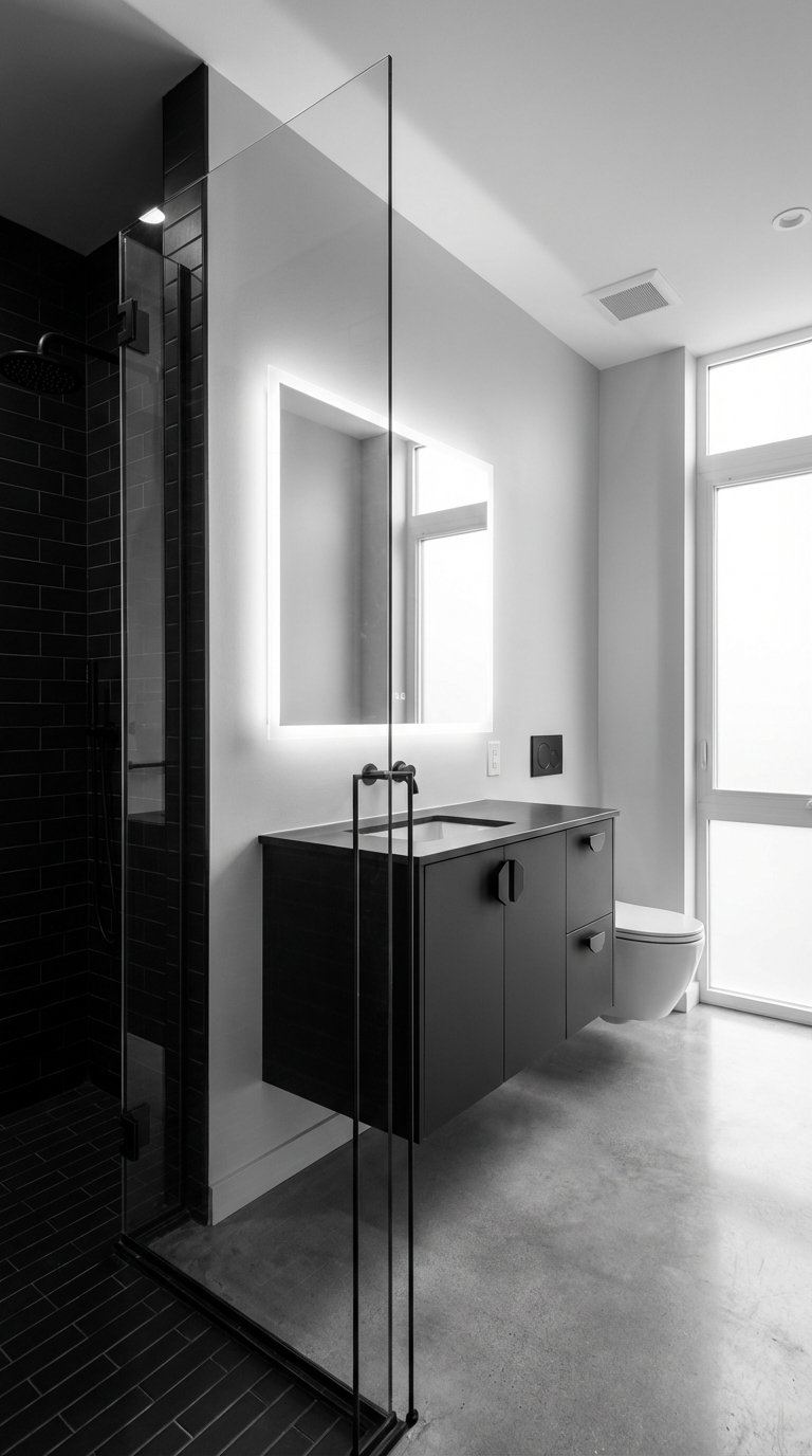 The star here is matte black concrete flooring or large-format tiles that mimic the look of stained concrete. The texture is imperfect, slightly cloudy, and incredibly forgiving of dust. We contrast this rough floor with Warm Metals—specifically exposed copper pipes or brushed bronze faucets. The design principle is Juxtaposition: the grit of the concrete floor highlights the shine of the metal and the clarity of the glass shower enclosures. Edison bulbs with warm filaments add a golden glow that softens the harsh black floor.