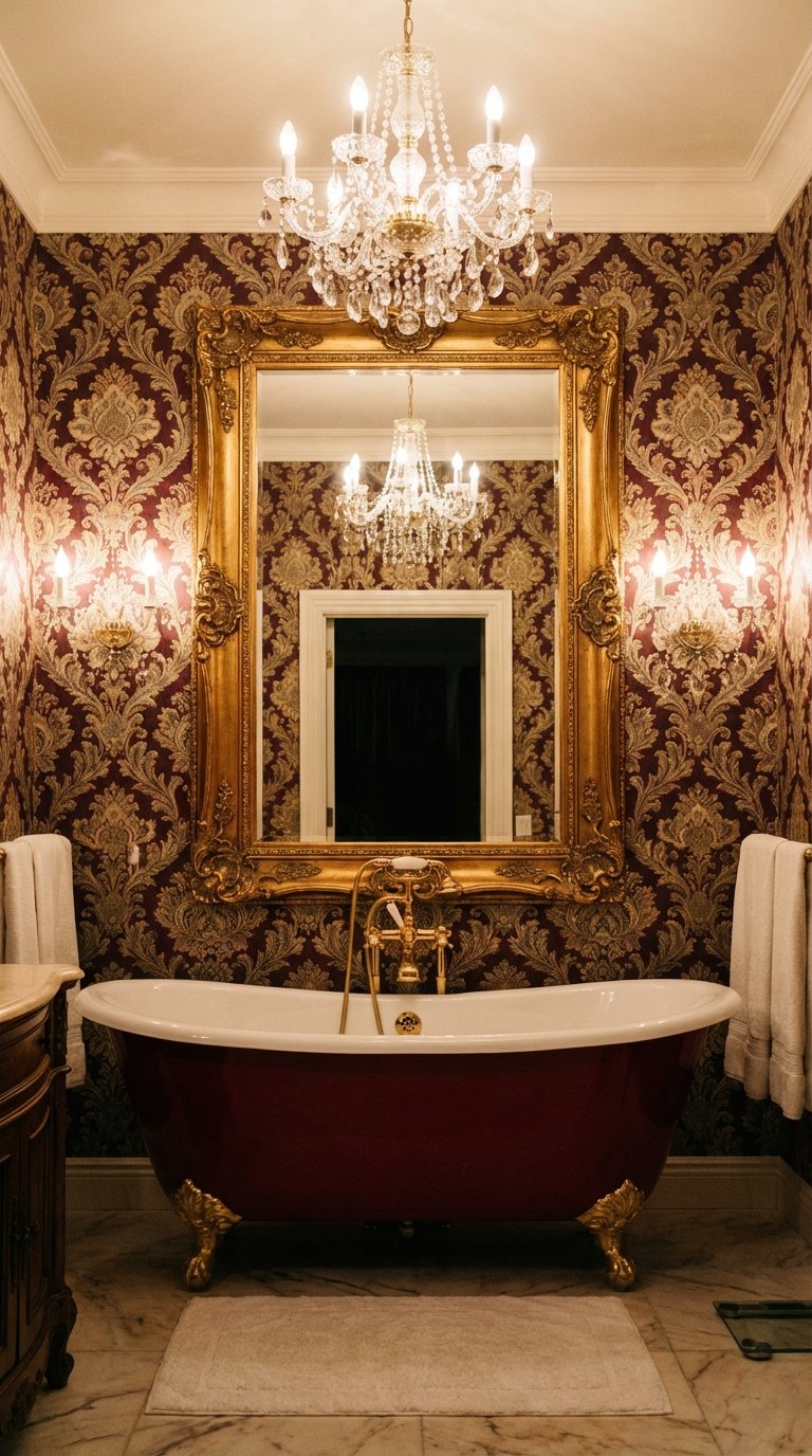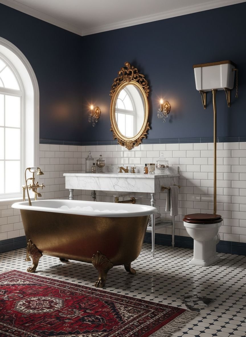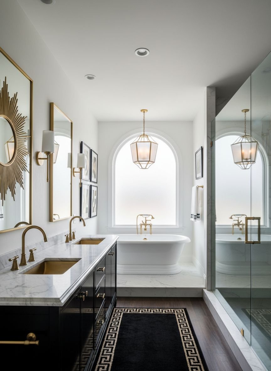 Hardware is non-negotiable: it must be Gold, Brass, or Polished Nickel. A clawfoot tub with gold feet or a vanity with gold inlay details fits perfectly. Mirrors should be geometric—hexagonal or arched—rather than simple rectangles. Wall colors can be bold; think emerald green or deep navy wallpaper with gold foil accents to match the floor’s intensity.