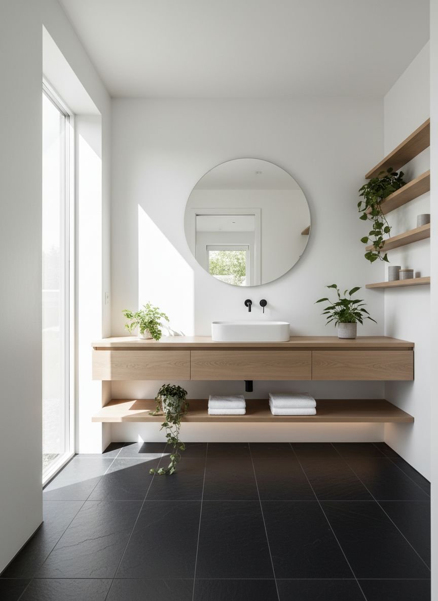 Pair the slate floor with a vanity in blonde wood (white oak, birch, or maple). The wood tone is crucial—it must be light to prevent the room from feeling heavy. Introduce soft textures: a waffle-knit robe hanging on a wooden hook, a bamboo bath mat, and woven seagrass baskets for storage. Lighting should be warm (2700K) to enhance the wood tones.