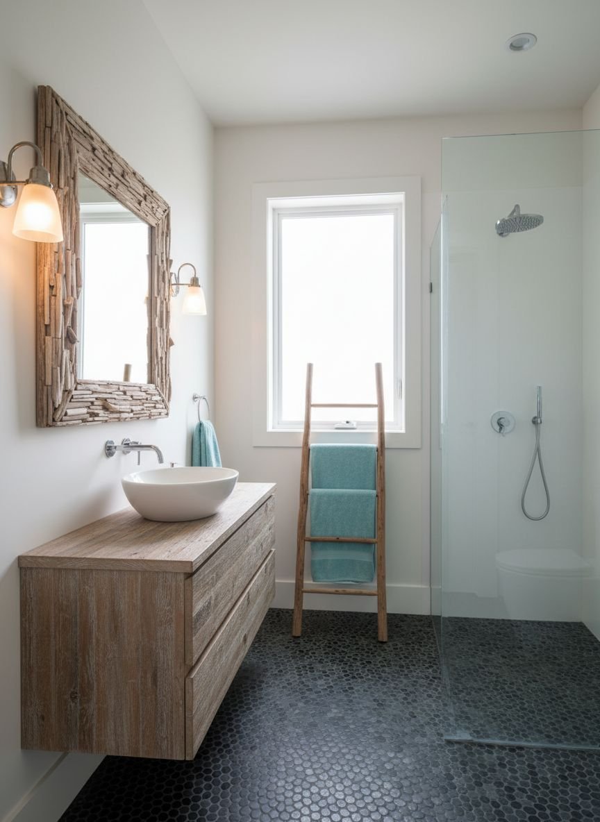 Instead of sandy beige tiles, we use Black Pebble Tiles or river rocks for the shower floor, transitioning to black wood-look planks in the main area. This mimics the dark, wet rocks found on a rugged coastline. The design principle is Textural Contrast. The rough, bumpy pebbles contrast beautifully with smooth sea glass accents and whitewashed wood elements, creating a sensory experience that mimics the outdoors.