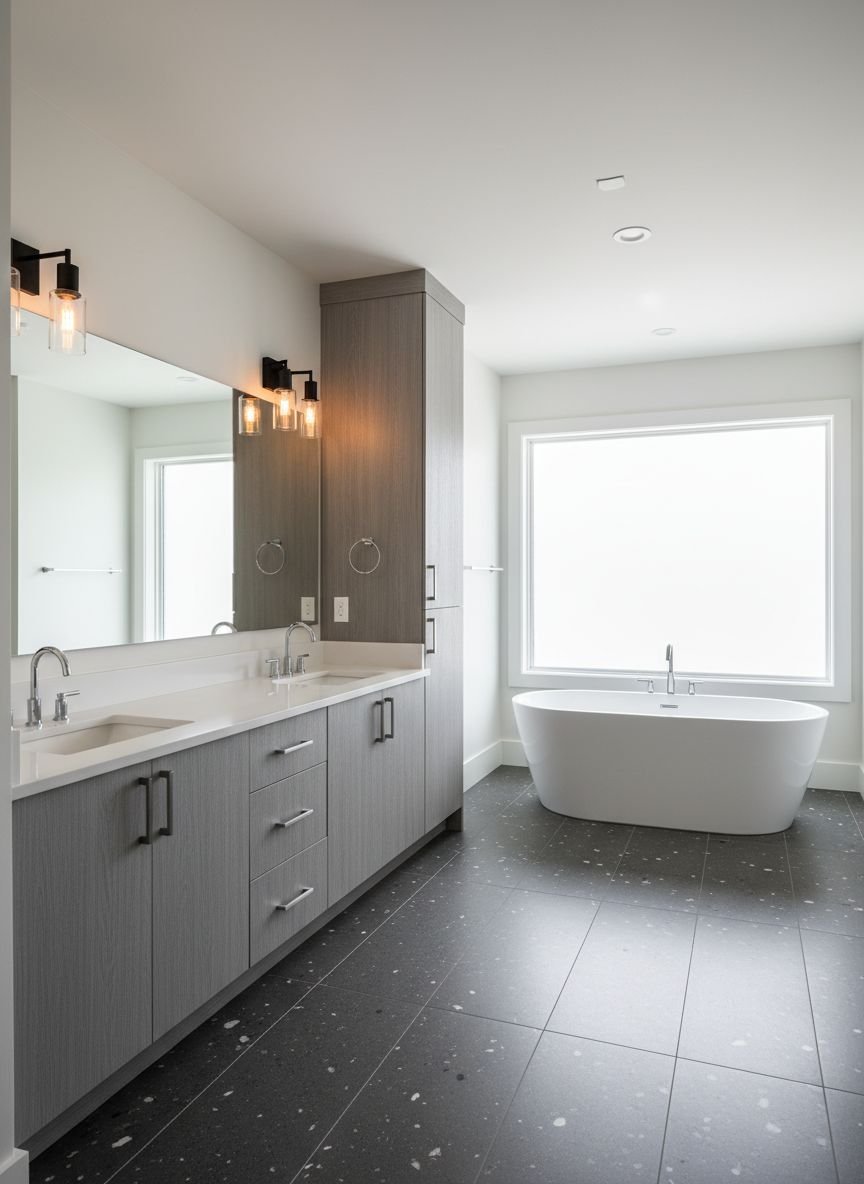 Here, we often see Black Granite or honed limestone tiles. The stone has a subtle speckle or movement that adds depth without being as loud as marble. The design principle is Balance and Neutrality. The black floor is paired with gray cabinetry (a hallmark of transitional style) and chrome details. It avoids the extremes of minimalism or maximalism, settling in a comfortable, elegant middle ground.