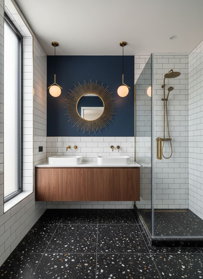 You must pair this floor with a Walnut vanity. The rich, dark wood tone against the black floor is a signature MCM look. Add globe lights (milk glass spheres) and a round mirror. Accessories should introduce pops of muted color—mustard yellow, teal, or olive green towels work beautifully against the black and walnut backdrop.