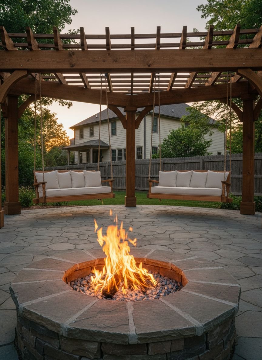 This layout works by defining a volume of space. The overhead beams of the pergola give the psychological feeling of a ceiling, making the area feel protected and enclosed. To implement this, anchor the pergola posts in concrete footings for stability. Hang a wide, deep-seated swing or a “bed swing” on one side, facing the fire pit. Ensure the swing hardware is rated for significant weight. This setup is perfect for storytelling, roasting marshmallows, or simply swaying gently while watching the kids play nearby.