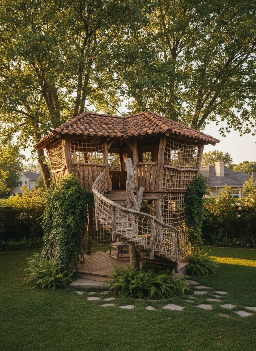 Nature-themed playgrounds are a massive trend because they encourage imaginative play and look beautiful. Instead of bright primary colors, this layout uses logs, stumps, boulders, and hills. The visual aesthetic is organic and earthy, blending seamlessly with the garden. A “stump jump” area, a tunnel made of willow branches, or a slide built into a small grassy hill are key features.