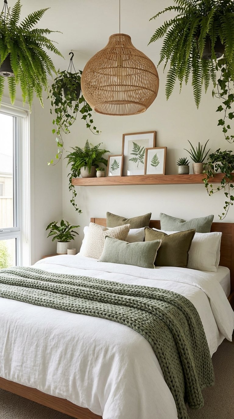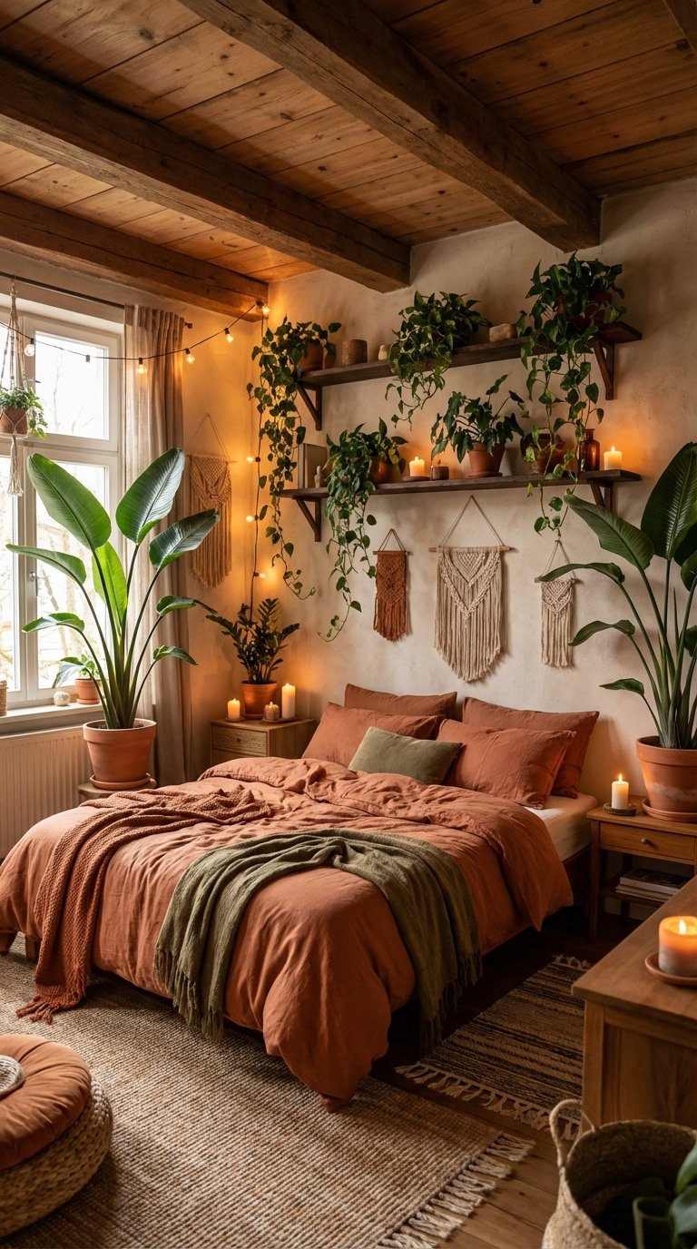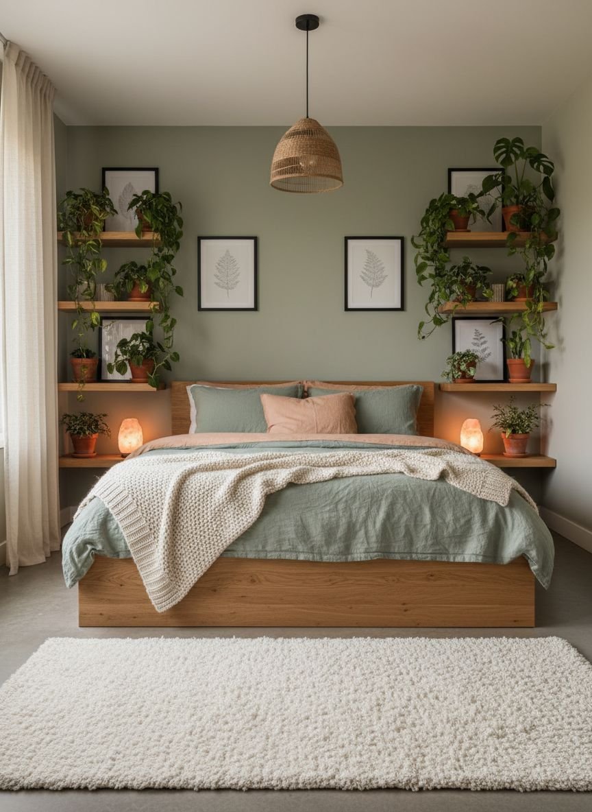 Green is the most restful color for the human eye, making it perfect for a bedroom. In a boho context, this often means bringing the outdoors in. A “Green” boho bedroom relies heavily on plants as decor. Trailing Pothos on shelves, a Snake Plant in the corner, and a Monstera by the window create a living tapestry. The walls can mirror this with soft green paint or botanical wallpaper.