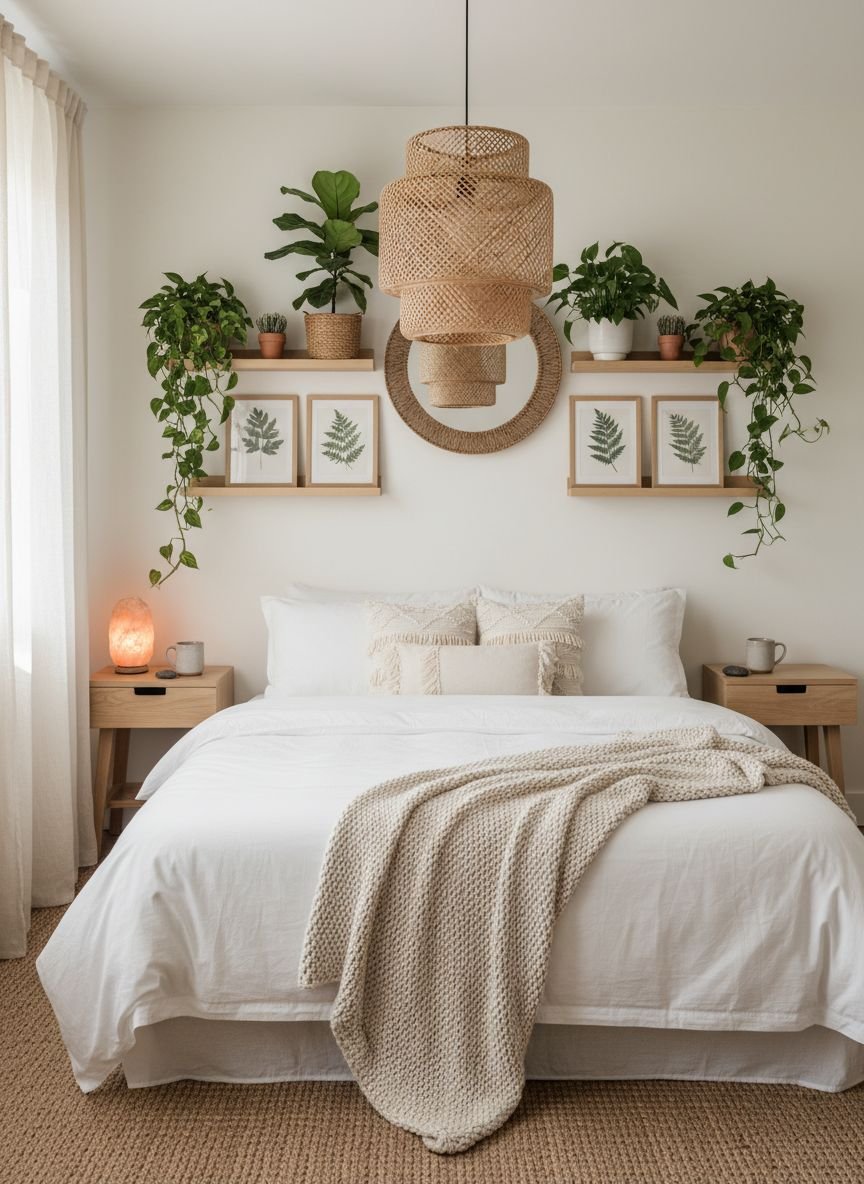 You can achieve a boho look cheaply by focusing on “soft goods” and second-hand finds. Visit thrift stores for unique wicker baskets or vintage wood frames. Instead of buying new furniture, simply layer inexpensive textured throw pillows and blankets over your existing bed. Adding plants (even cuttings from friends) is the most affordable way to add instant boho vibes.