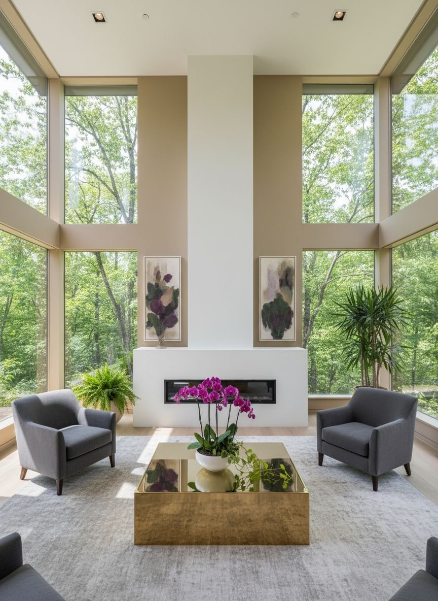 Privacy can be a concern with such expansive glass. Sheer curtains are a perfect solution. They diffuse harsh sunlight and block the view from outside during the day while maintaining that airy feel. For total privacy at night, layer heavy drapes or automated roller shades that disappear into a recessed ceiling pocket when not in use. Keep the window frames minimal—black aluminum or warm wood—to frame the view without distraction.