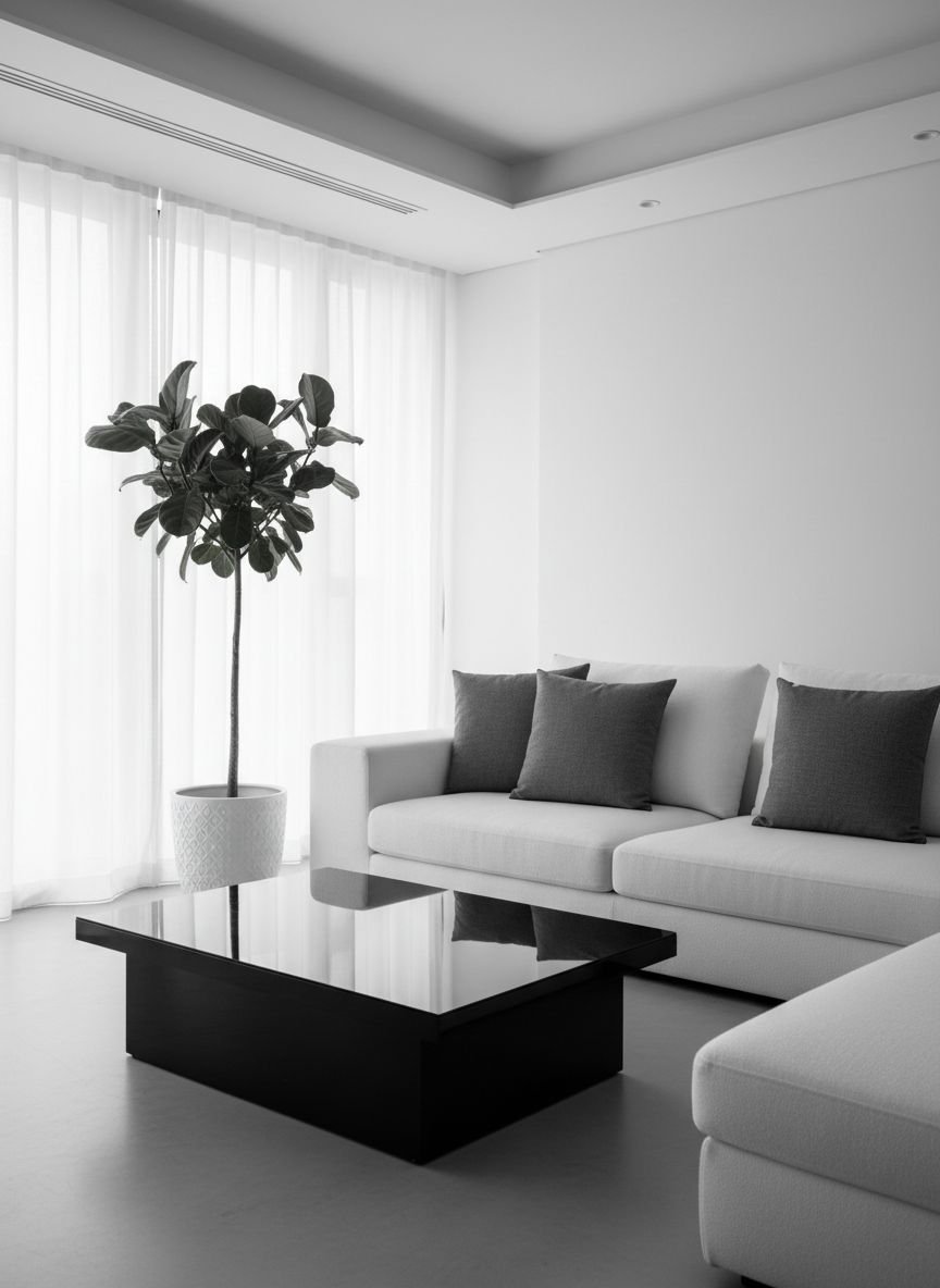Pro Tip: Add a living plant. The burst of green looks vibrant against a monochrome backdrop and brings life to the room.