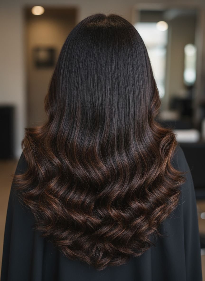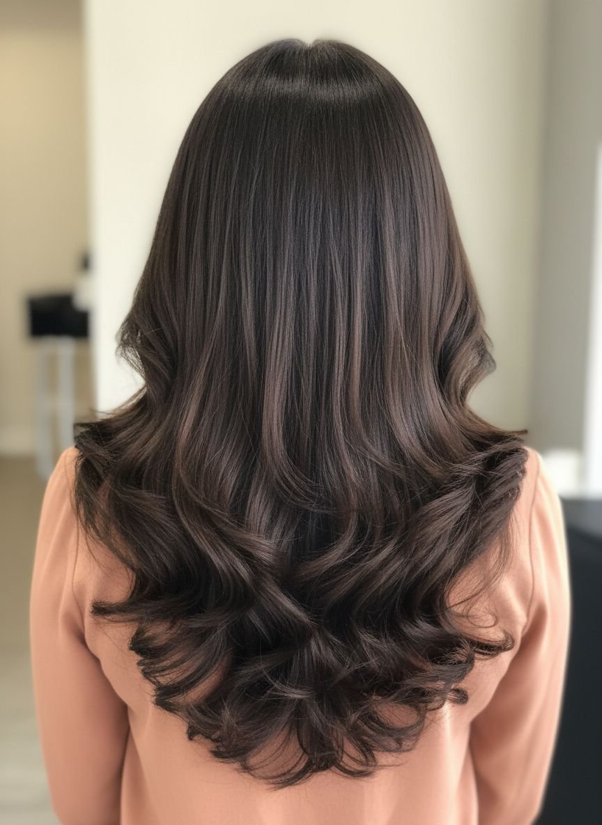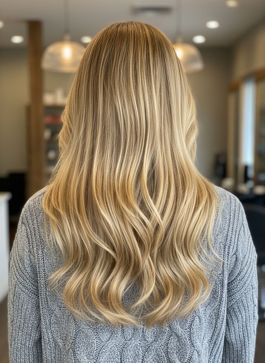 The aesthetic here is “Rapunzel” but modern. It allows you to keep the length you worked hard to grow while ensuring the ends look thick and lush. It pairs beautifully with balayage color techniques. The curve of the haircut complements the hand-painted highlights, allowing the lighter pieces to cascade naturally over the darker base.