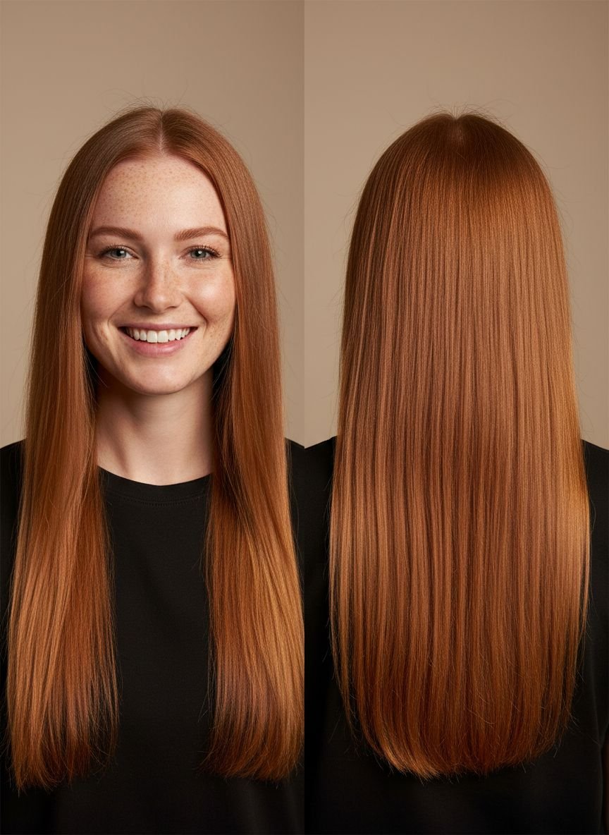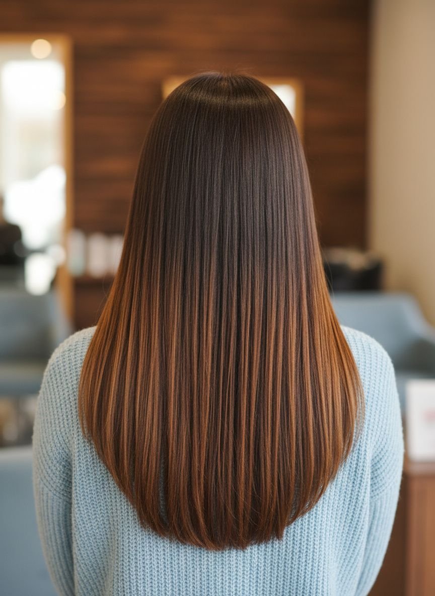 Pro Tip: To maintain that glass-hair finish, use a flat iron only on the bottom two inches of your hair, curving slightly inward to emphasize the U-shape.