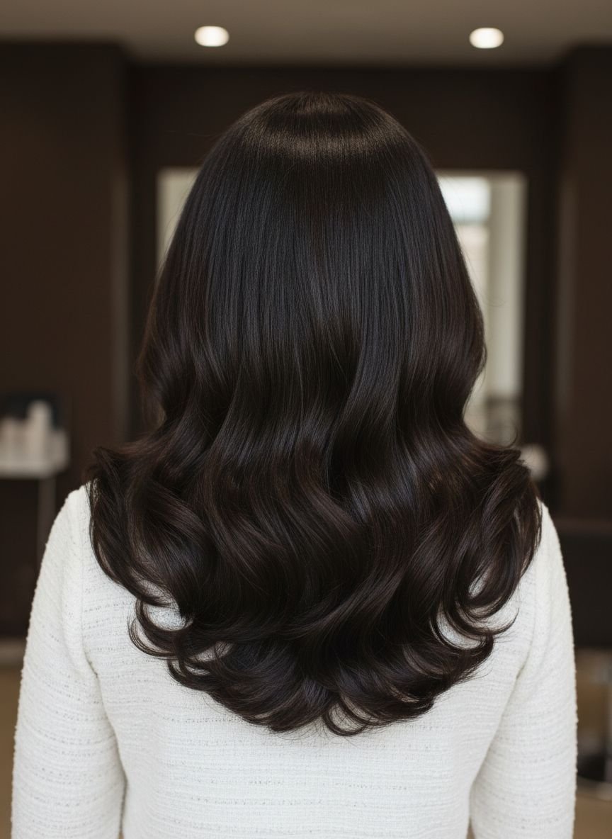The design principle here is continuity. By keeping the layers long and minimal (starting below the chin), the hair surface remains unbroken, allowing light to bounce off it evenly. This is the antithesis of the choppy shag; it is about fluidity and weight. It works exceptionally well for dark hair colors—espresso, jet black, or deep chocolate—where the silhouette of the U-shape is clearly visible against lighter clothing.