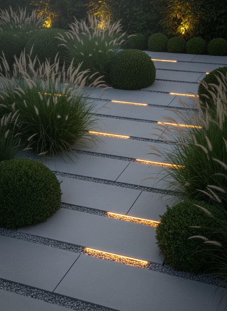 Lighting is what takes a garden from good to breathtaking. Modern lighting design avoids traditional lantern styles. Instead, it focuses on the effect of the light rather than the fixture itself. Linear LED strips are perfect for this. You can hide them under the lip of a retaining wall, beneath floating benches, or along the edges of a pathway. This creates a wash of light that defines the hardscaping. It makes floating steps look like they are truly hovering.