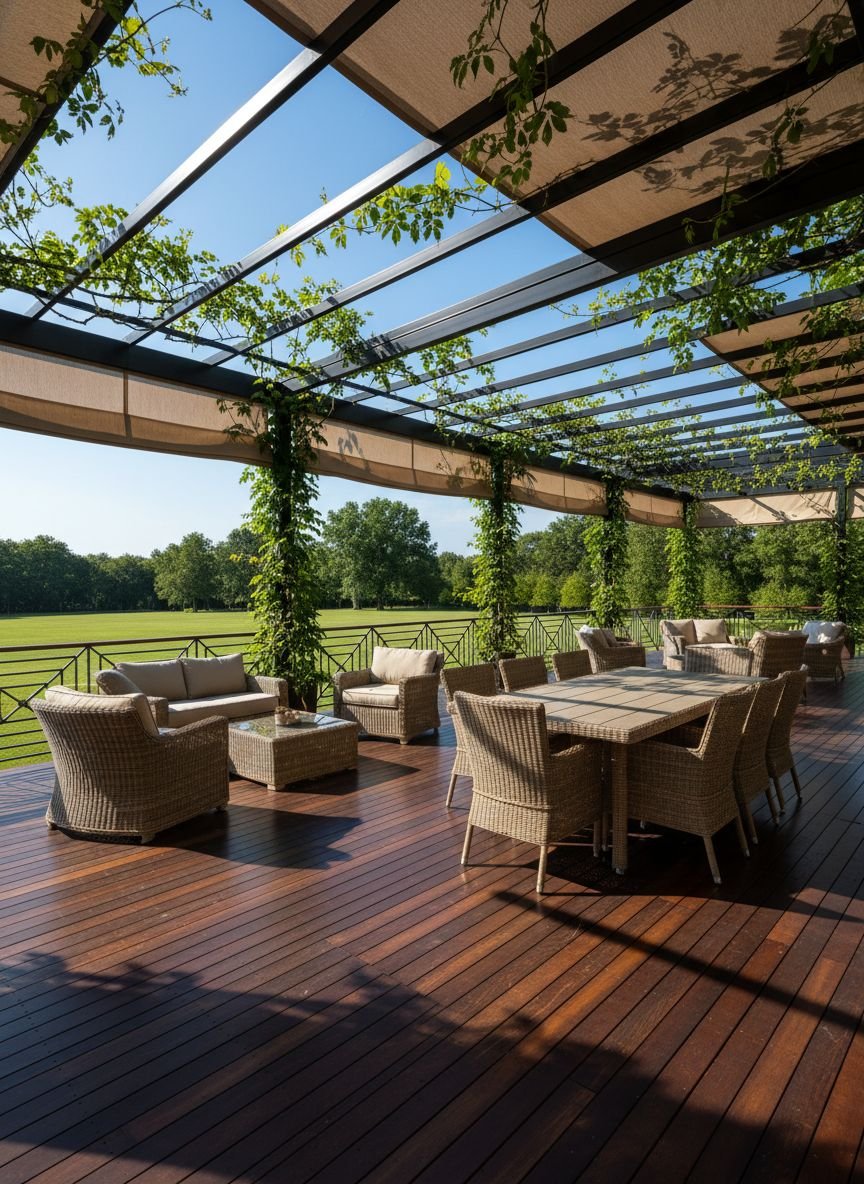 You can install retractable canvas shades or fixed louvers between the vertical posts. This gives you control over the environment, allowing you to block the sun or wind as needed. The structure defines the “ceiling” and “wall” of the outdoor room simultaneously, creating a cozy, enclosed feeling without blocking airflow. For more patio structures, check out 15 Inspirational Modern Patio Ideas for Your Backyard Retreat That Instantly Upgrade Your Home.