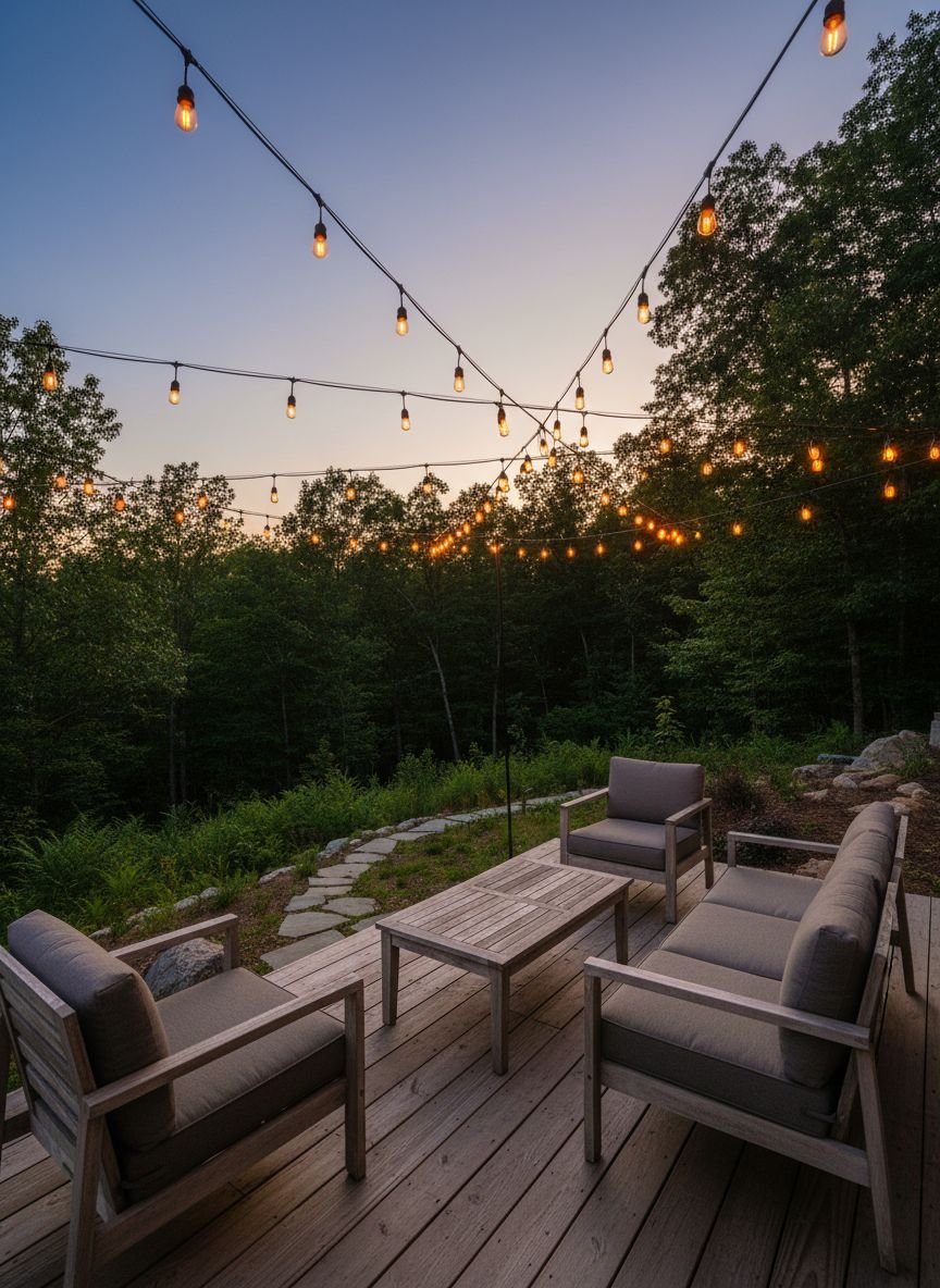 Combine the lights with sheer outdoor curtains hung on a tension rod for a soft, romantic effect. The fabric catches the light and moves with the breeze, adding a dreamy, ethereal quality to the deck. This setup is flexible, affordable, and instantly makes the space feel festive and welcoming. For more DIY lighting projects, see 15 Gorgeous Outdoor DIY Decor Projects for Summer That Instantly Upgrade Your Backyard Sanctuary.
