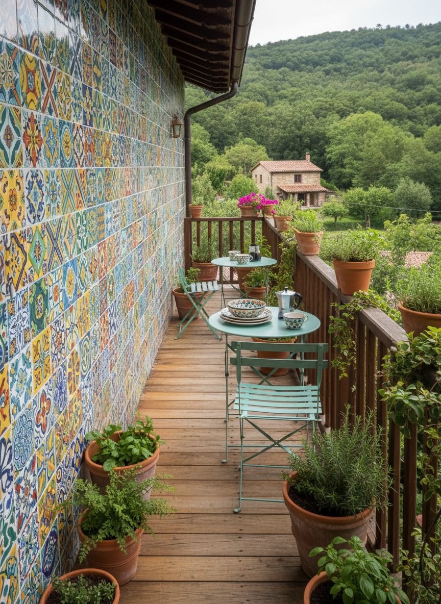 Bringing tile outdoors introduces vibrant color and permanent pattern to your deck walls. This technique draws inspiration from Mediterranean and Moroccan courtyards where walls are art, not just boundaries. Frost-proof porcelain or cement tiles withstand temperature fluctuations and resist fading from UV rays. You can tile an entire feature wall or create a framed “rug” effect on a vertical surface to anchor a dining or lounge area.