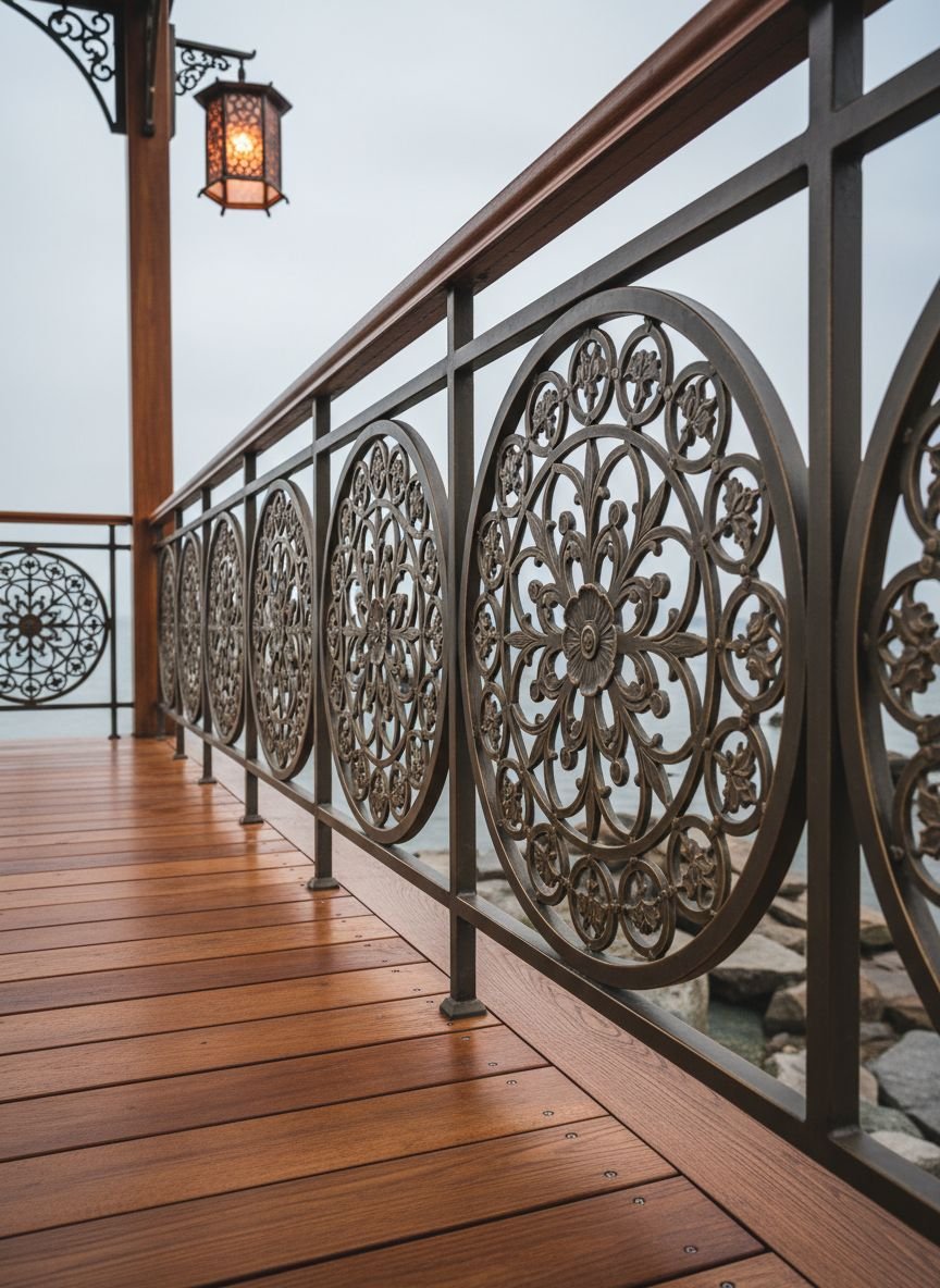 Laser-cut metal screens act as functional art, providing privacy while casting intricate shadows across your deck. Materials like Corten steel develop a protective, rusted patina that adds industrial warmth and requires zero maintenance. Aluminum panels with powder-coated finishes offer a sleeker, more modern alternative in black, white, or bronze. These panels work exceptionally well in windy areas, as the perforations allow air to pass through rather than blocking it completely.