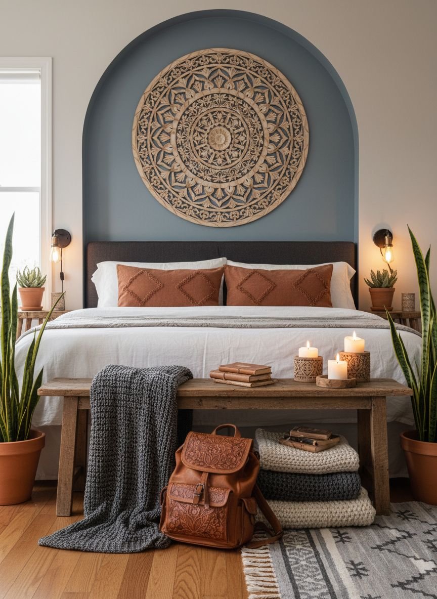 Alternatively, look for a carved wooden headboard (often called a mandala headboard). These intricate carvings add depth and shadow. If you prefer softness, an upholstered velvet headboard in a rust or emerald tone adds a touch of luxury. For a DIY approach, paint a large arch on the wall behind the bed in a contrasting earth tone. This frames the bed perfectly without taking up any floor space.