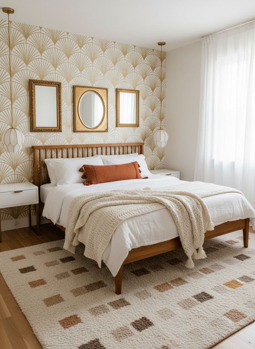 Apply these shades on your walls or through large textiles like curtains and rugs. A terracotta accent wall behind the bed warms up the room instantly. If you prefer white walls, bring these colors in through your bedding layers and furniture. Warm wood tones in your dresser or nightstand also count towards this palette. Avoid jarring neon brights or cool, sterile grays. You want the light to bounce off these surfaces and cast a golden glow across the room.