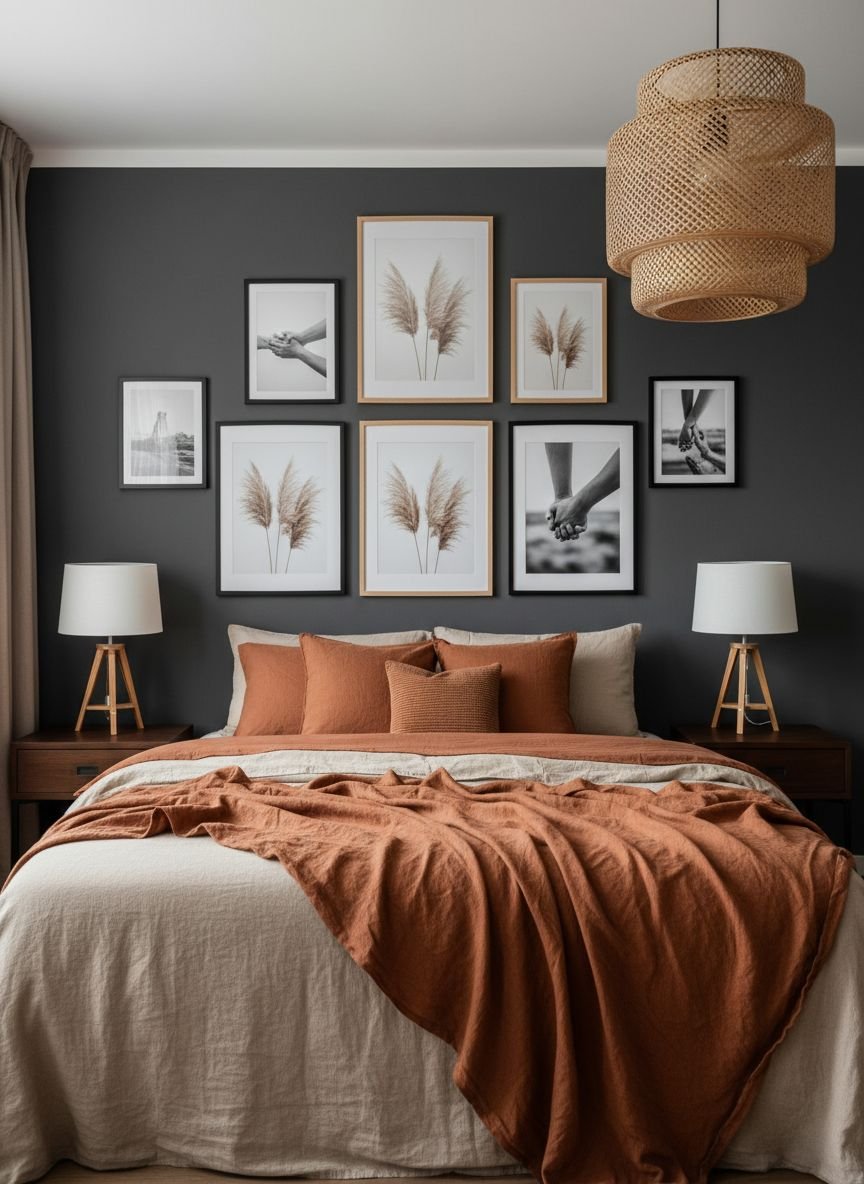 Earthy boho bedroom colors ground the space and connect your interior to the natural world outside. You want to mimic the hues found in nature to induce a state of calm. Think of the reddish-brown of terracotta pots, the soft green of dried sage, the warm beige of sand, and the deep brown of rich soil. These colors work harmoniously because they share a warm undertone.