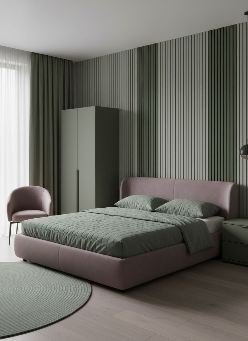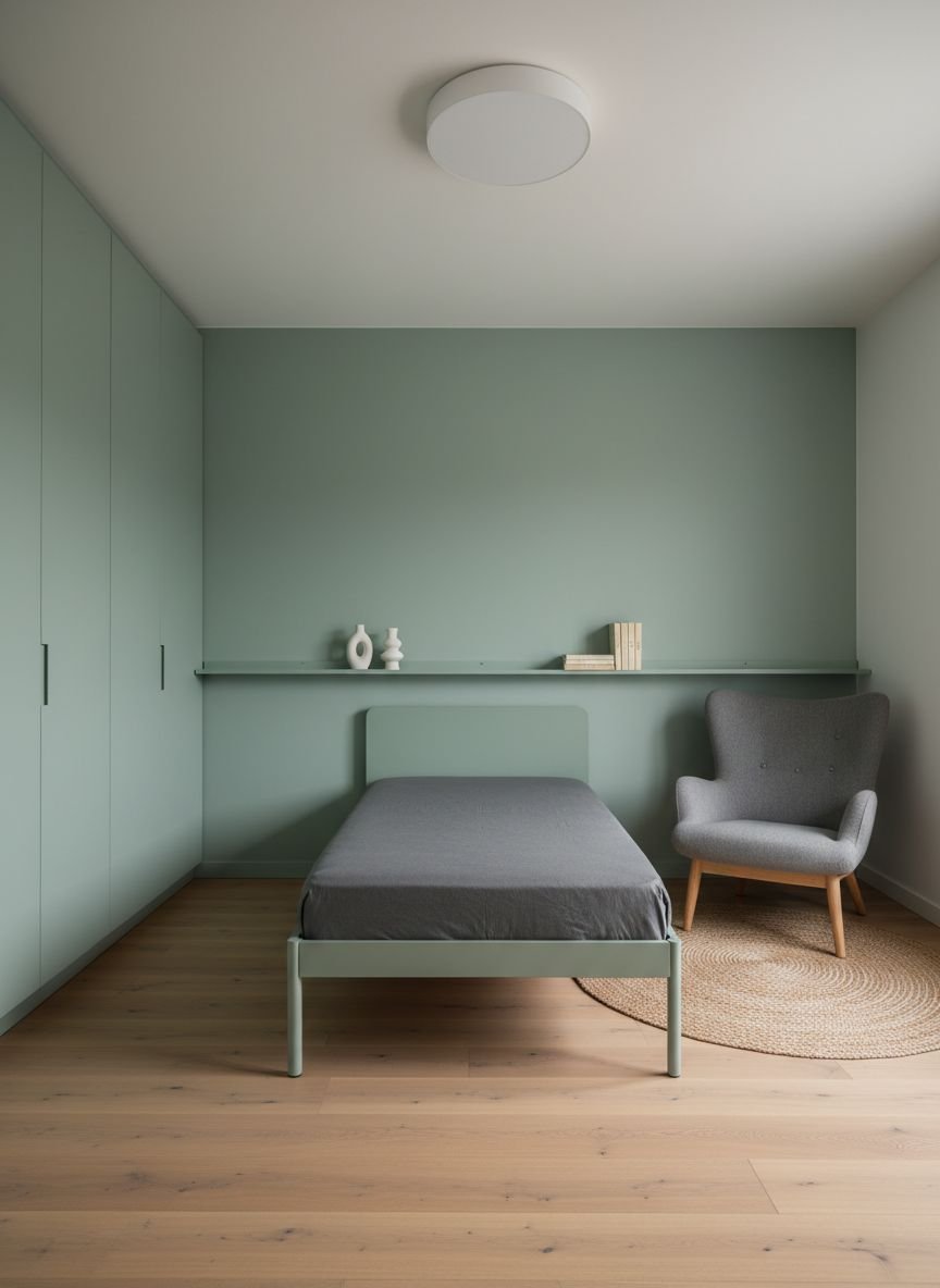 Choose furniture with clean lines and exposed legs, which help the room feel more spacious. A simple gray platform bed without a footboard is ideal. Keep surface decor to an absolute minimum—perhaps just a single glass vase with a eucalyptus branch on the nightstand. The sage paint becomes the main decoration, proving that color can be a minimalist’s best friend when used with restraint.