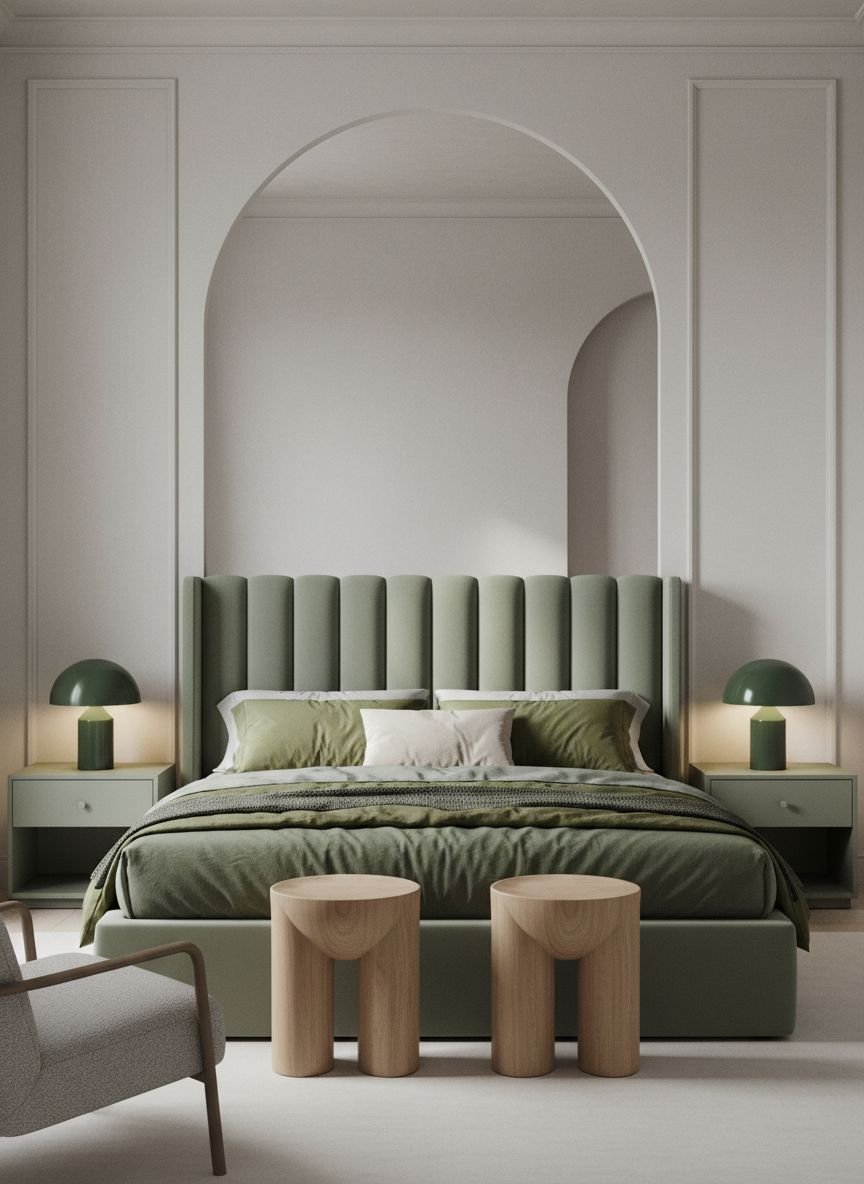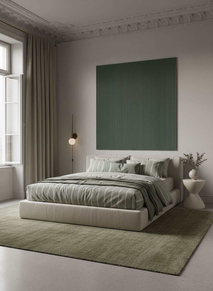 Style the bed with layers of linen in neutral tones—oatmeal, white, and soft gray. The rougher texture of linen contrasts beautifully with the smooth finish of a modern bed frame. Flank the bed with wall-mounted sconces instead of table lamps to free up nightstand space and emphasize the vertical height of the sage walls. This setup is perfect for modern apartments where maximizing vertical space is crucial.