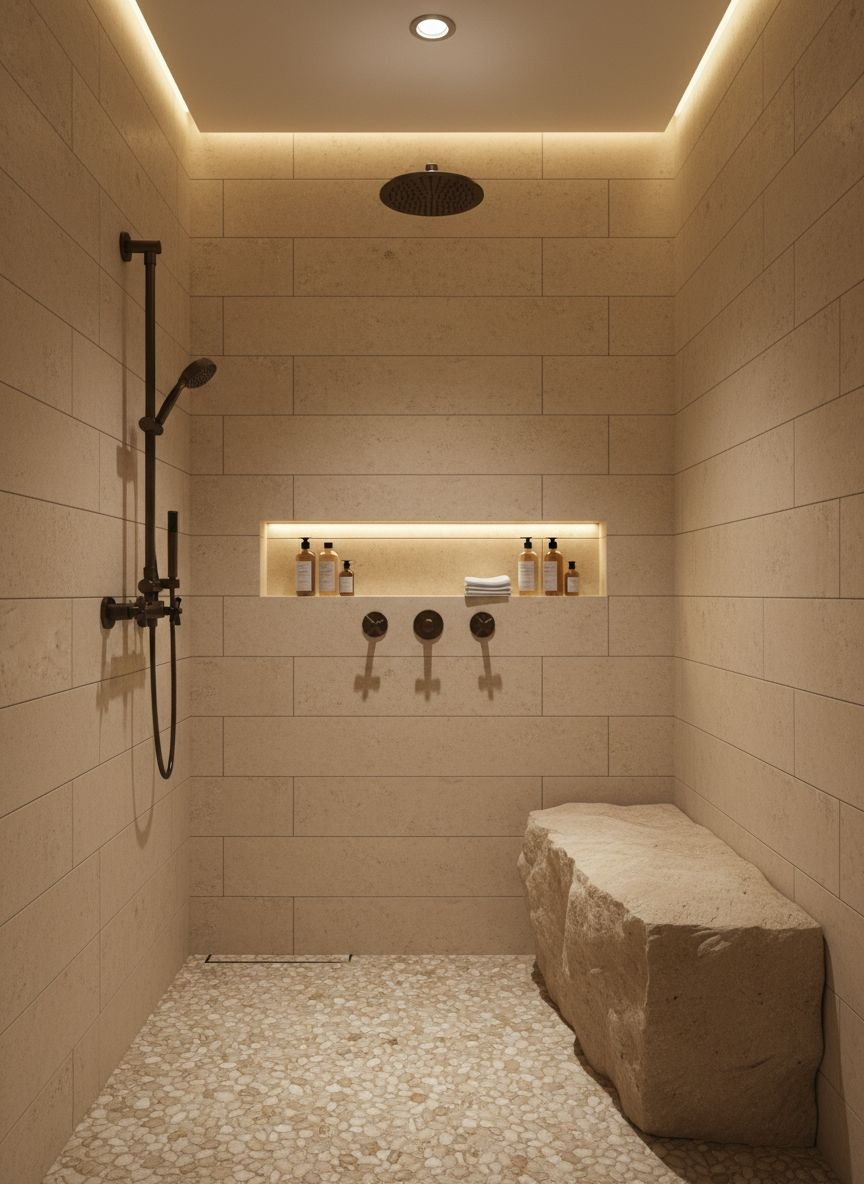 A bench adds a true spa feeling. It invites you to sit and let the steam work. It also provides a practical spot for shaving legs or storing products. The most seamless look involves floating benches. These are anchored to the wall with no legs touching the floor. You can use the same stone slab as your vanity counter. This ties the room together.