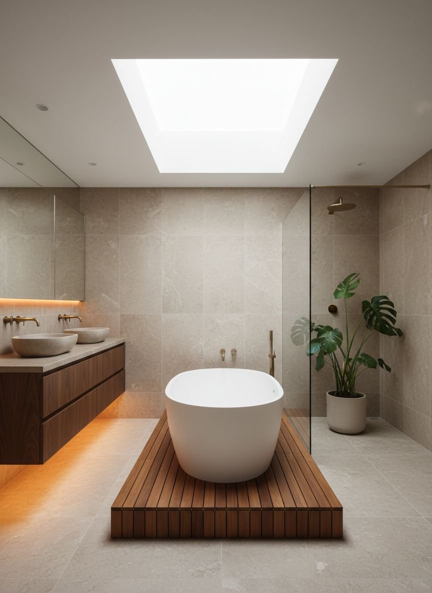 Keep the color palette strict. White, concrete grey, or warm beige. The beauty comes from the shadow and light. A skylight above a minimalist shower is a game-changer. Natural light acts as the decoration. It changes throughout the day. This style is easy to clean and timeless.