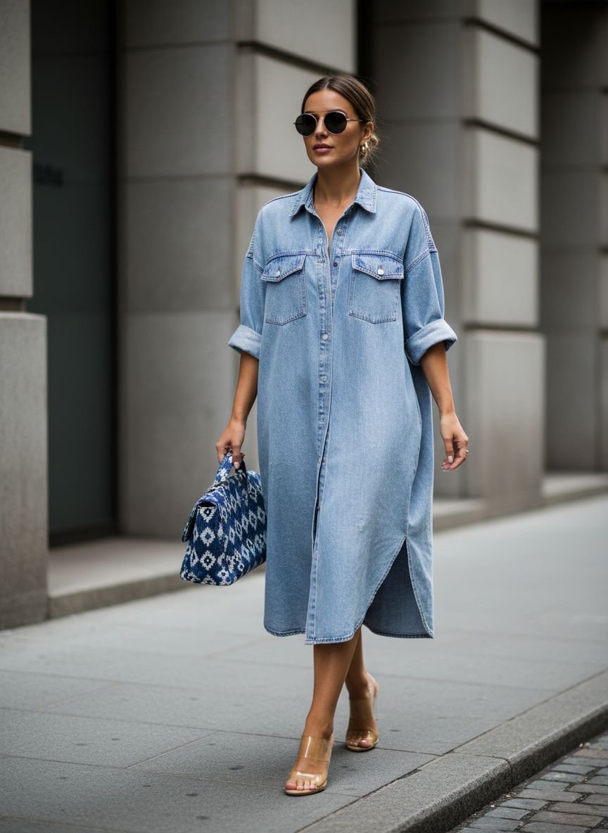 The “Canadian Tuxedo” is back, and styling it with an oversized denim shirt is the modern way to wear it. Pair a chambray or denim oversized shirt with jeans in a similar or contrasting wash. The key to making this look intentional rather than accidental is the mix of weights. Your shirt should be a lighter, softer denim than your jeans.