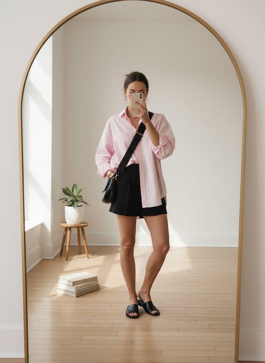 This combination balances the coverage of a long-sleeve top with the breeziness of shorts, making it ideal for transitional weather or cool summer evenings. The visual appeal here comes from the “long over short” proportion play. You can either tuck the shirt fully into high-waisted denim shorts for a classic look or leave it unbuttoned over a crop top for a relaxed, beachy vibe.