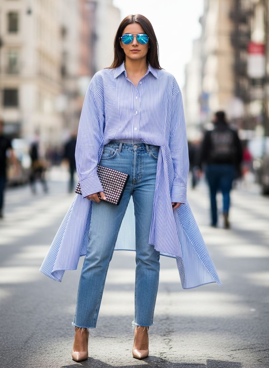 To keep this from looking sloppy, focus on the details. A crisp collar, cuffed sleeves, and clean shoes are essential. This is a favorite “uniform” for creatives and designers because it is practical yet stylish. You can wear the shirt loose for a tunic style or do a French tuck to highlight the waistband of the jeans. Dark wash denim elevates the look for evening, while light wash distressed denim keeps it strictly casual.