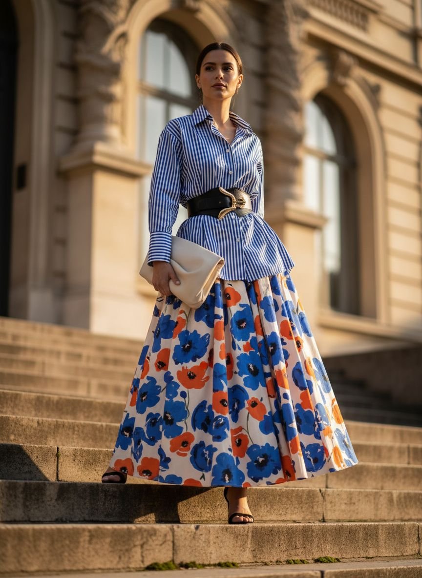 Contrasting the loose, masculine energy of an oversized shirt with the feminine, fitted structure of a high-waisted skirt creates a powerful visual balance. The high waistline of the skirt demands that the shirt be tucked in, which emphasizes the smallest part of your torso. The volume of the shirt then blouses out above the waistband, creating an inverted triangle shape that makes the waist look even smaller.