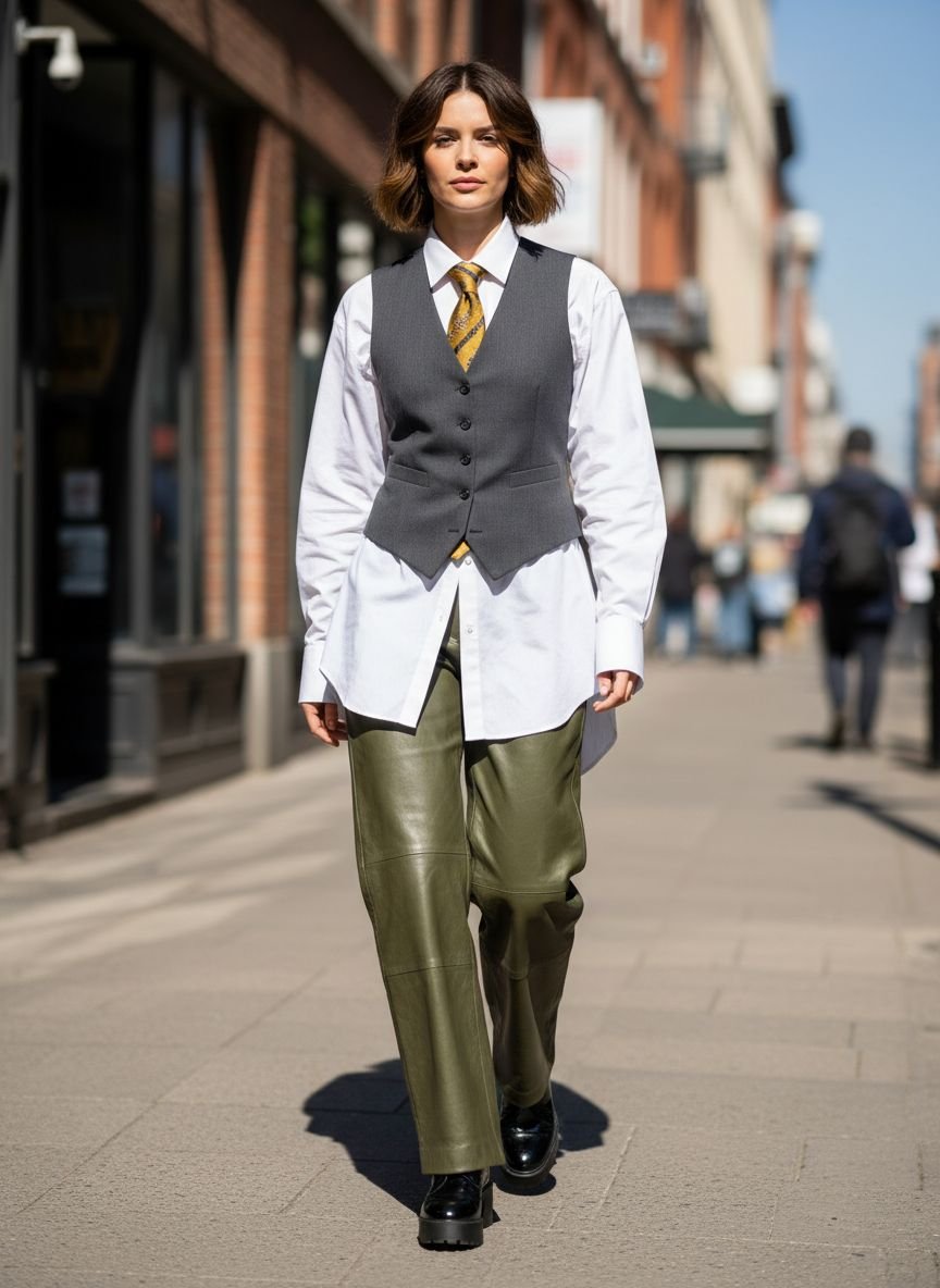 Play with patterns here. A solid white shirt under an argyle or houndstooth vest creates a striking focal point. Ensure the vest is slightly cropped or hits at the waist; if the vest is too long, it will compete with the length of the shirt and make your torso look disproportionately long. Let the shirt tails hang out from under the vest for a relaxed, layered look that feels curated and cozy.