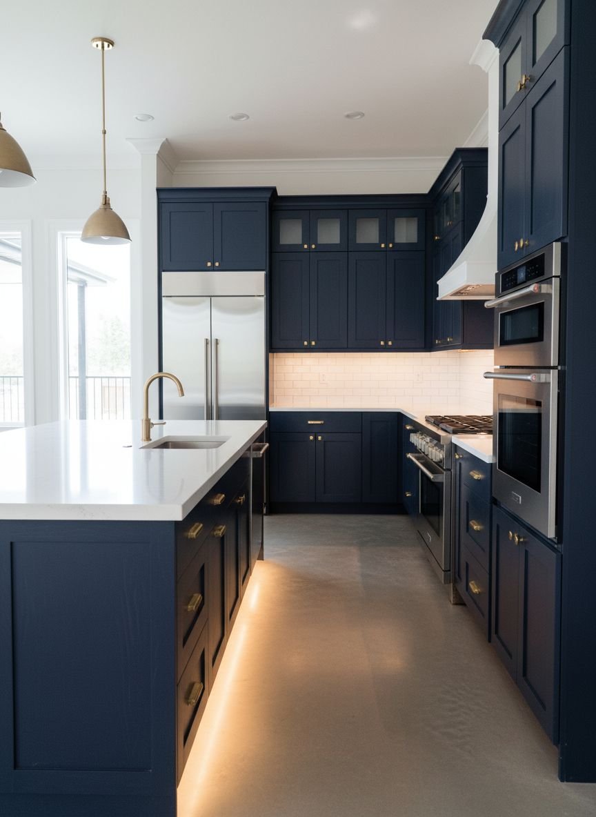 Lighting is not just functional; it is a design element. Integrating LED strip lighting into your navy cabinetry can transform the look entirely. Consider adding toe-kick lighting (lights at the base of the floor cabinets) to make the heavy navy cabinets appear to “float.”