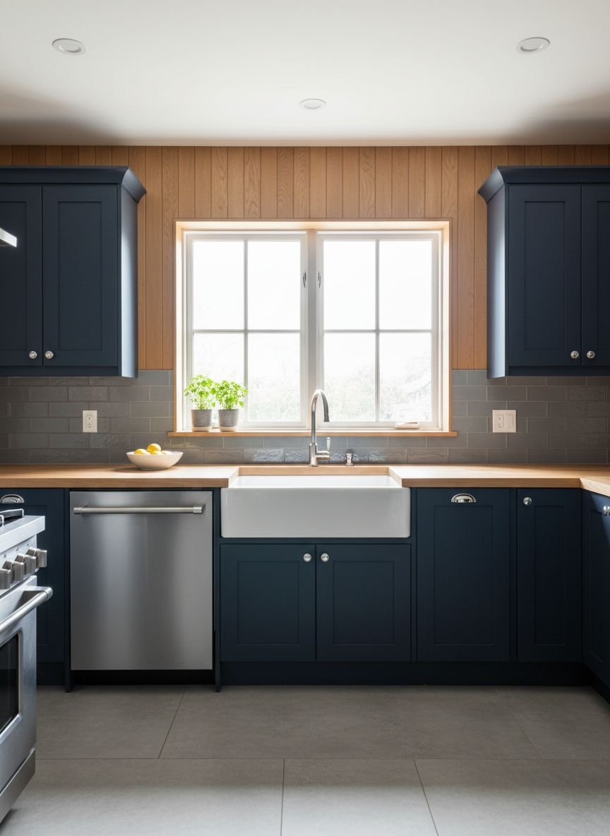For those who want to push boundaries, a “Dark & Dramatic” kitchen pairs navy cabinets with other dark elements. Imagine navy cabinetry against a charcoal grey wall, or paired with a black soapstone countertop. This “tone-on-tone” layering creates a rich, immersive environment that feels incredibly cozy and sophisticated.