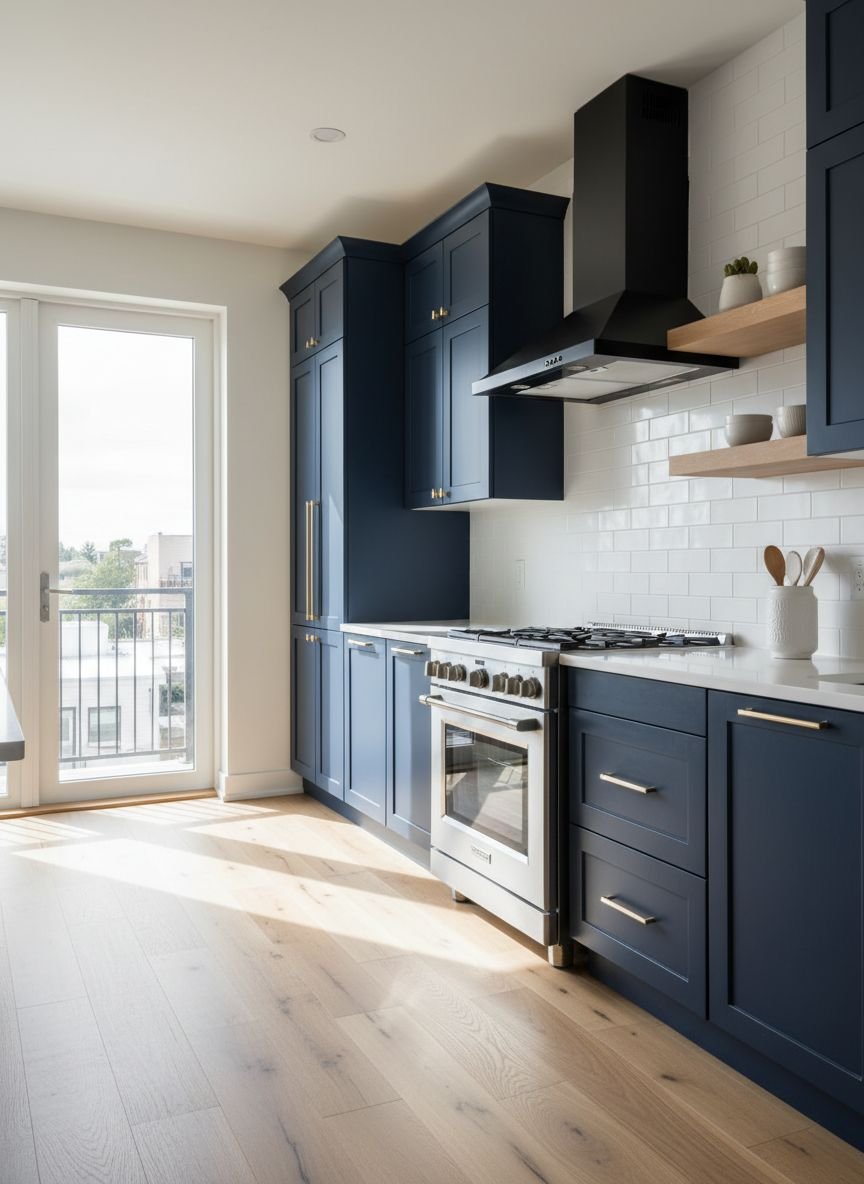 Not necessarily! While dark colors absorb light, you can balance this by using white countertops, light-colored walls, and good lighting. If your kitchen is very small, consider using navy only on the lower cabinets and keeping the upper cabinets white. This “tuxedo” style grounds the room without closing it in.