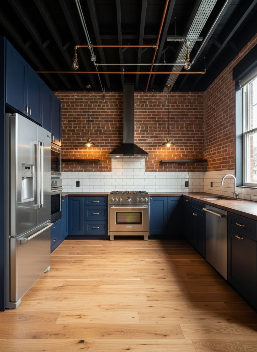 The navy adds a layer of polish to the raw industrial elements, preventing the space from looking like a garage. It creates a “refined industrial” look that is very popular in city lofts and converted warehouses. A matte finish on the cabinets works best here, complementing the matte texture of brick and concrete.