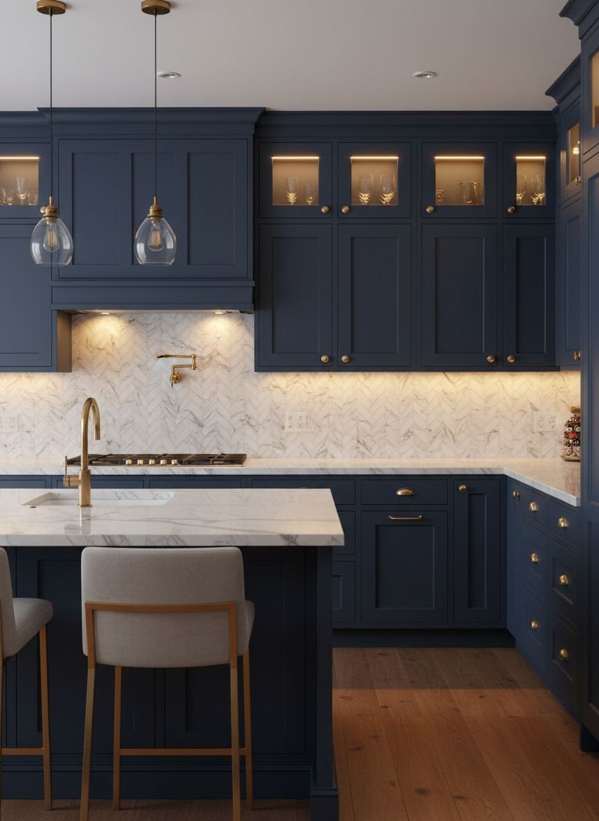 Modern elegance is about balancing the boldness of navy with soft, luxurious touches. This style often incorporates glass-front upper cabinets to break up the heaviness of the dark blue. By painting the interior of the cabinets the same navy shade and adding soft internal lighting, you create a display case for your best dishware. It transforms storage into art.